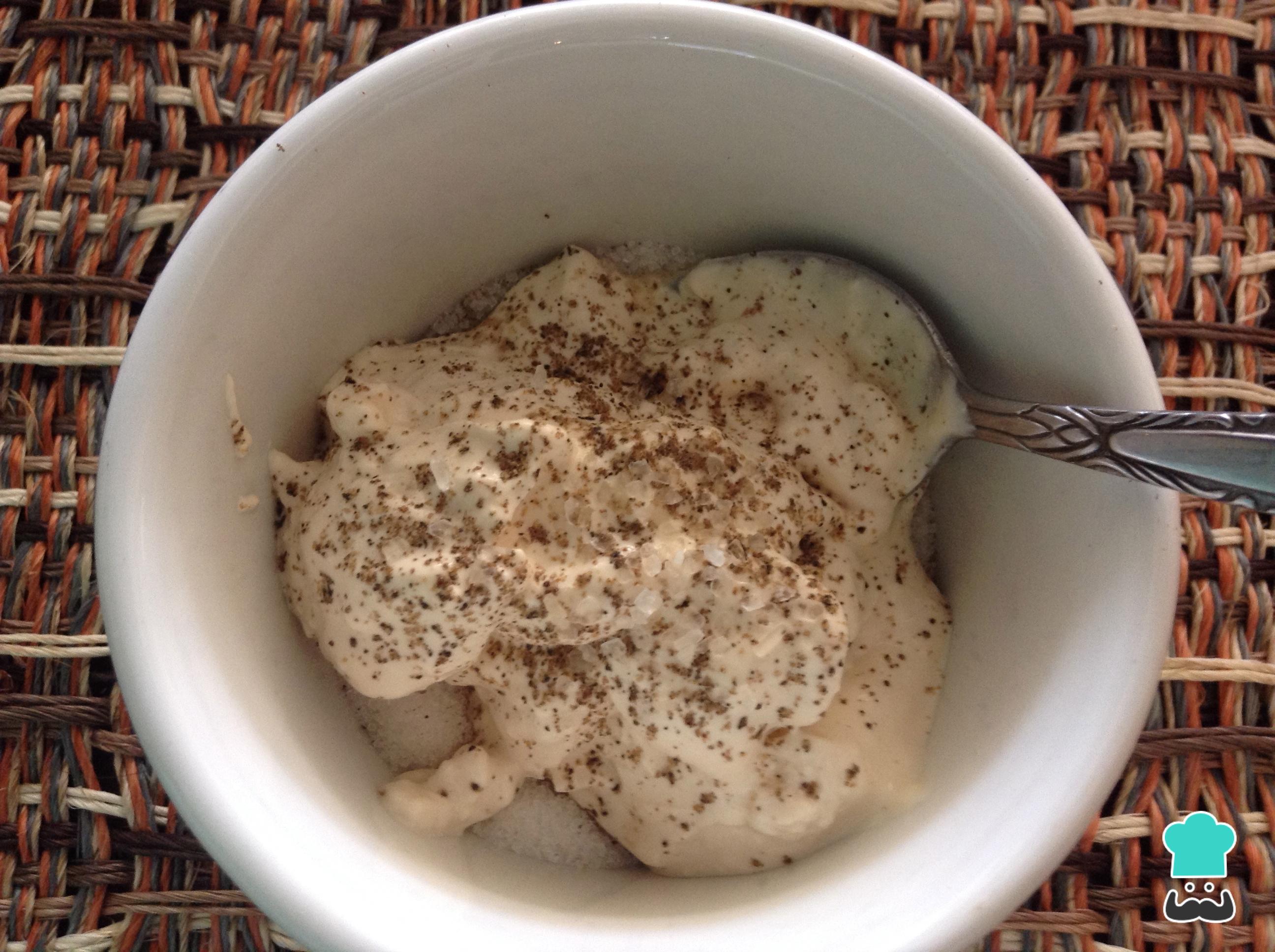 En un bowl adicionar dos cucharadas de crema de leche, pimienta, sal, y una cucharadita de azúcar.