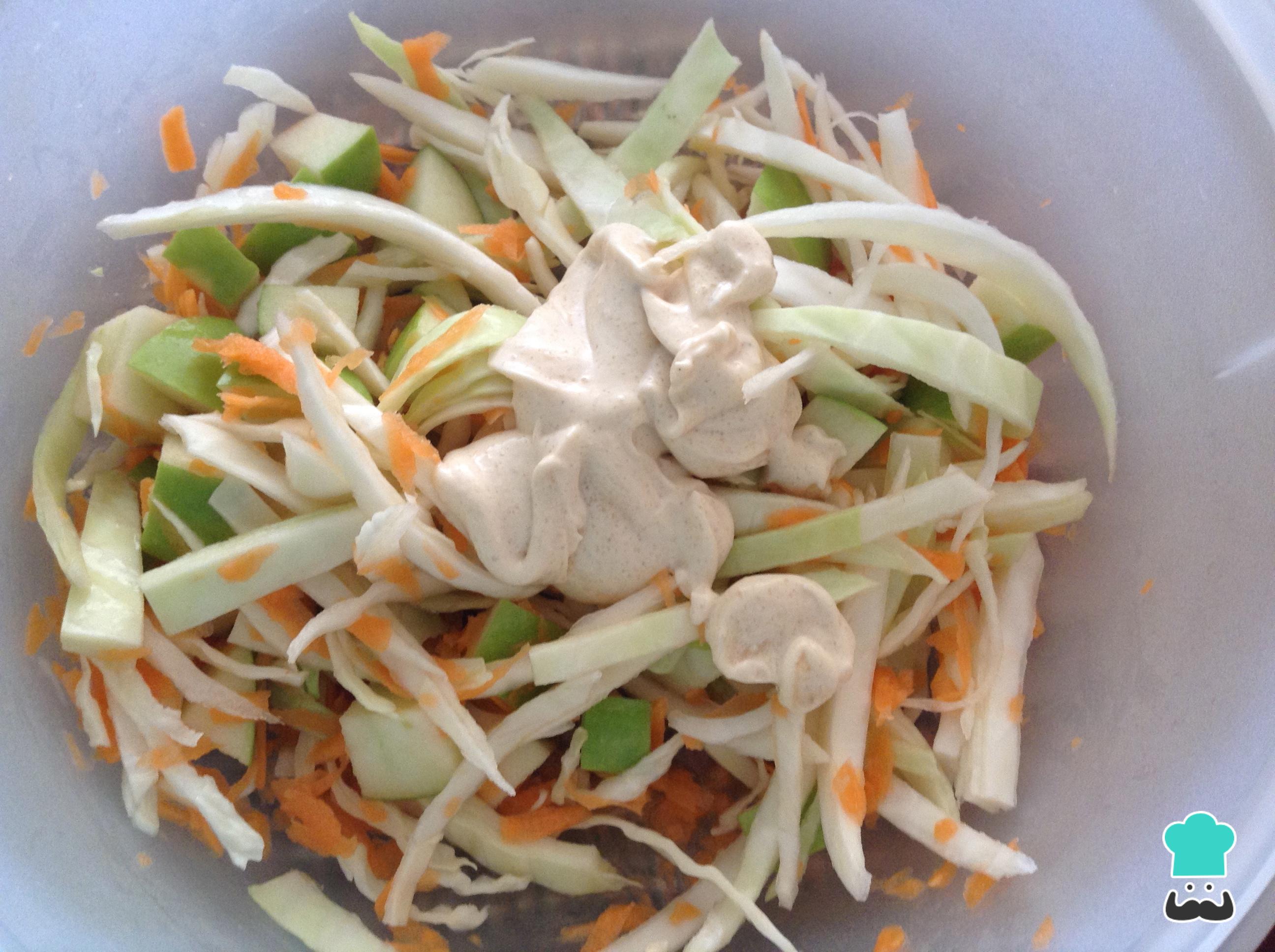 Mezclar el paso anterior en la ensalada de col.Mezclar hasta integrar bien todos los ingredientes.