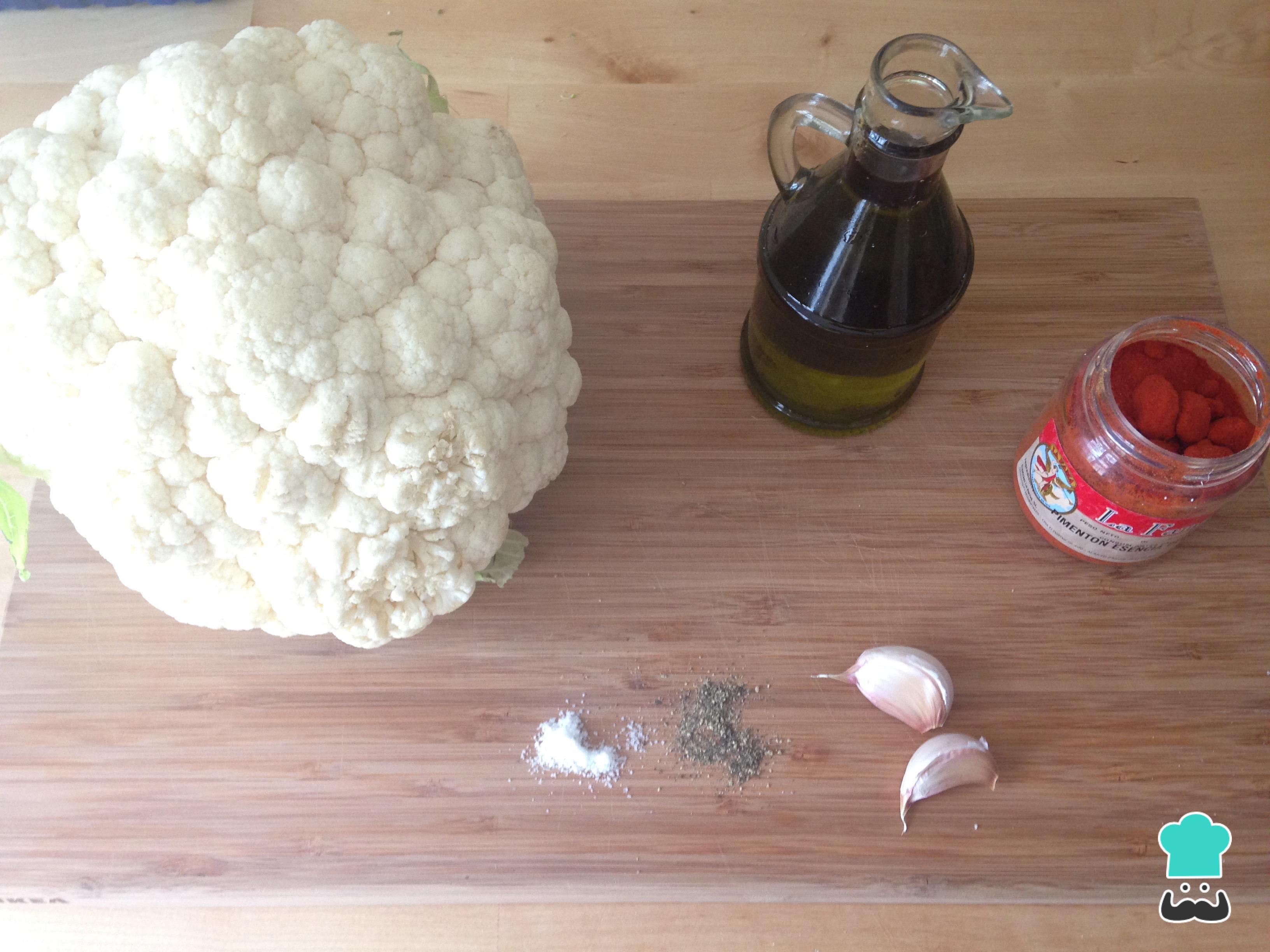 Reunimos los ingredientes para elaborar la ensalada de coliflor con ajos salteados.