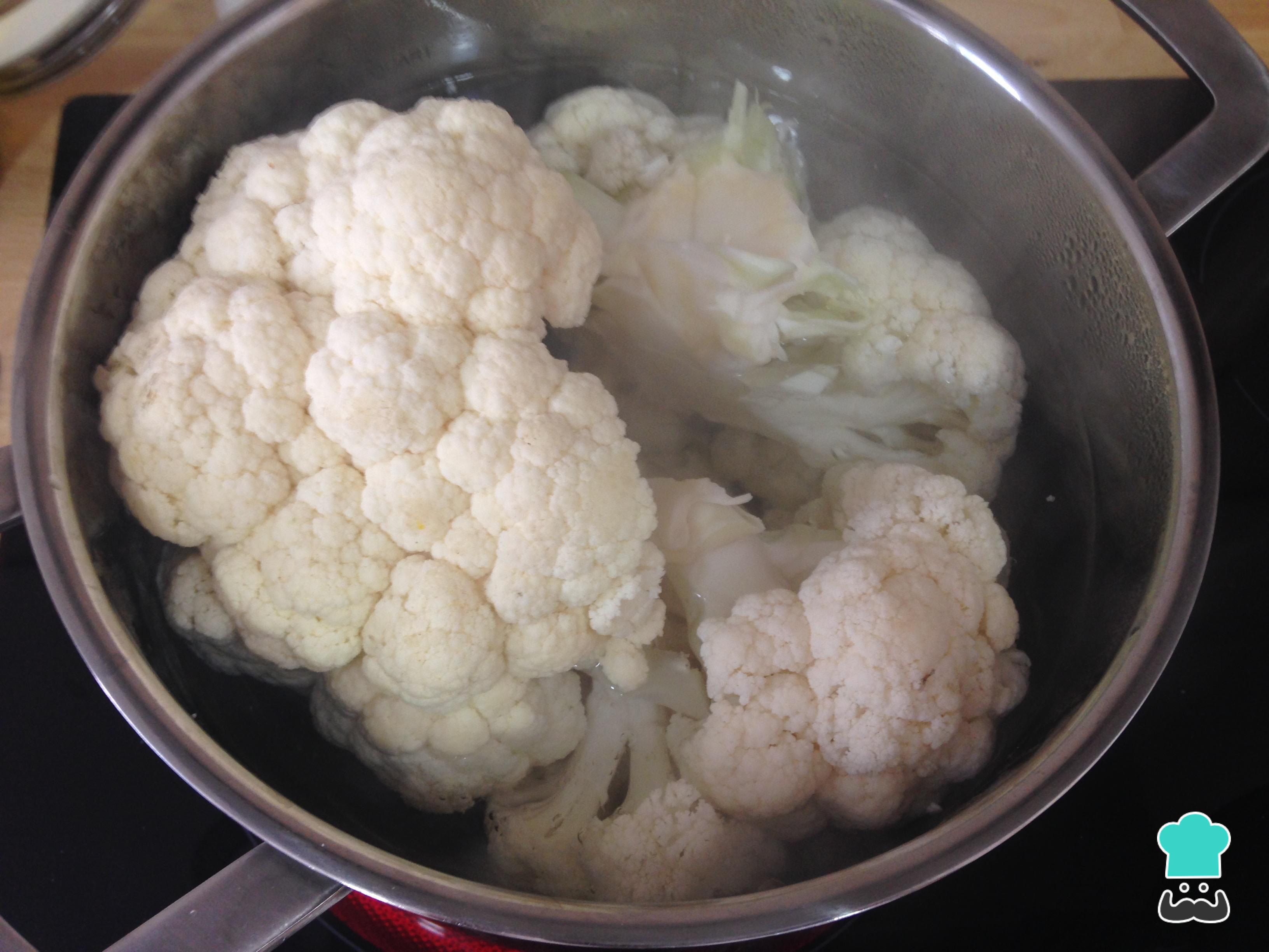 Cocemos la coliflor en abundante agua hirviendo durante 15 minutos. Para ello, podemos trocearla en 4 partes.