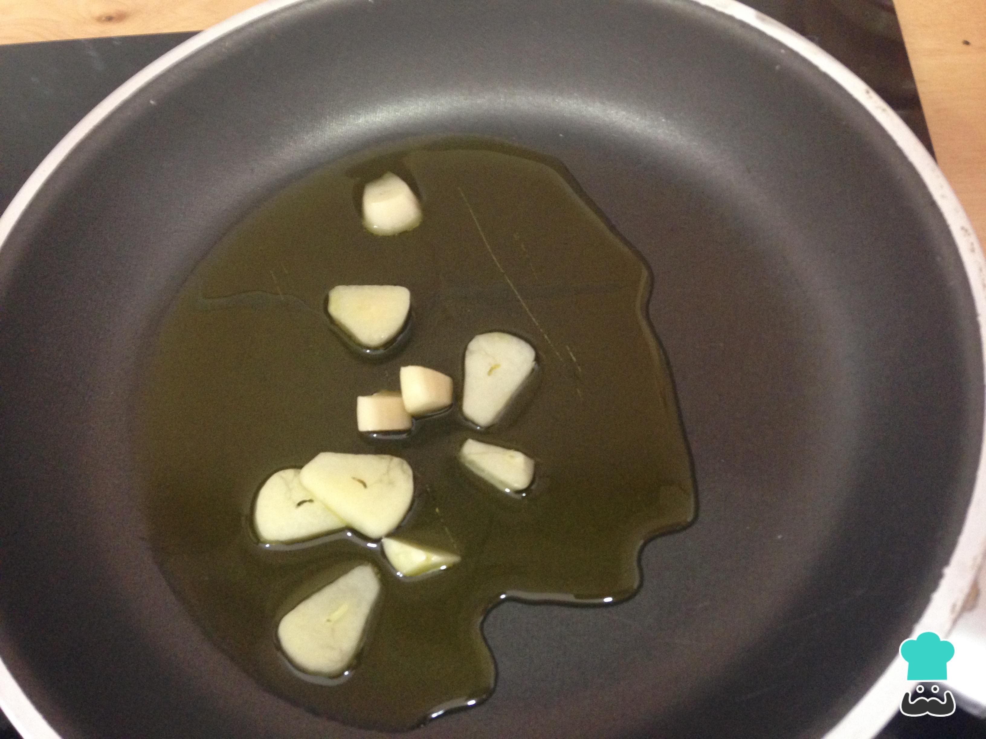 Mientras, salteamos los ajos fileteados en una sartén con aceite de oliva. Dejamos que se doren y reservamos.