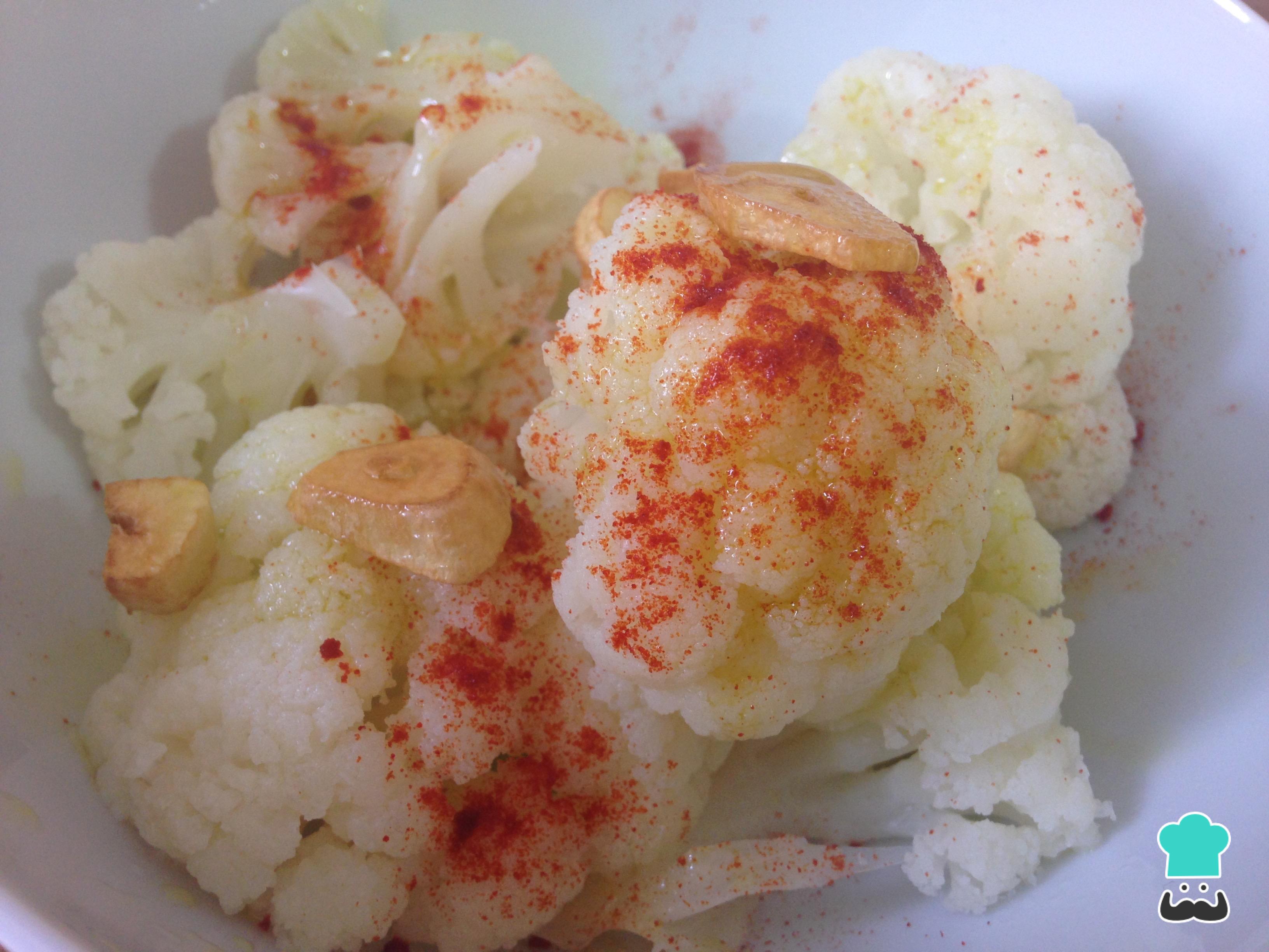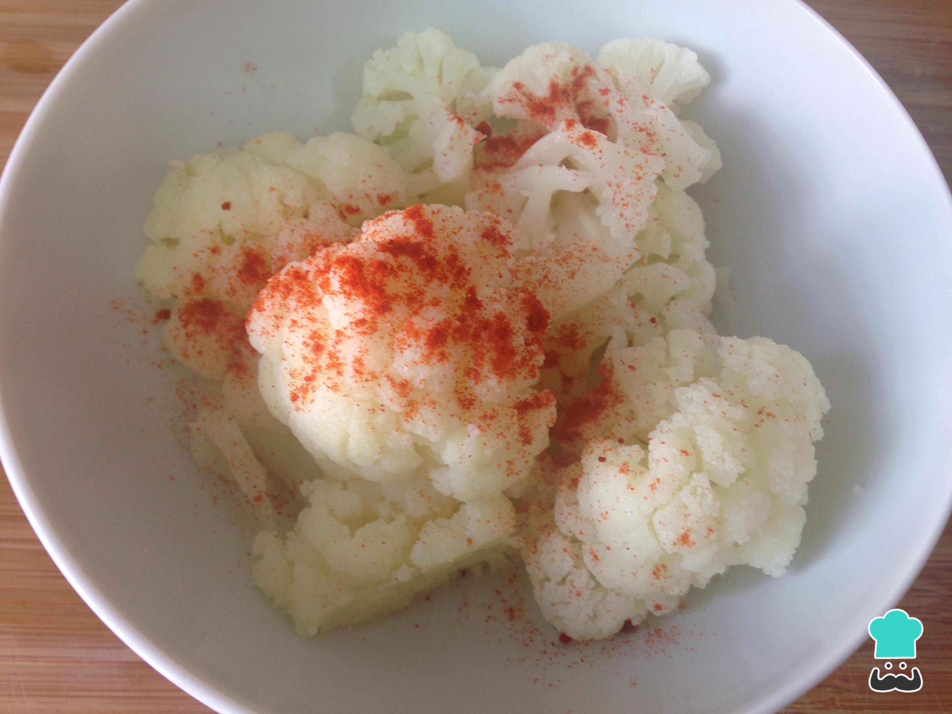 Una vez cocida, escurrimos la coliflor, colocamos en una ensaladera y aliñamos la coliflor con pimentón dulce, sal y pimienta negra molida.
