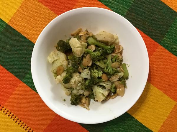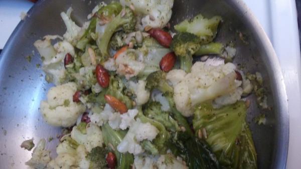 Cuando estén tiernos, escurrimos la coliflor y el brócoli y los añadimos a la sartén con los ajos y las almendras. Ponemos un poco de sal y de pimienta negra recién molida.