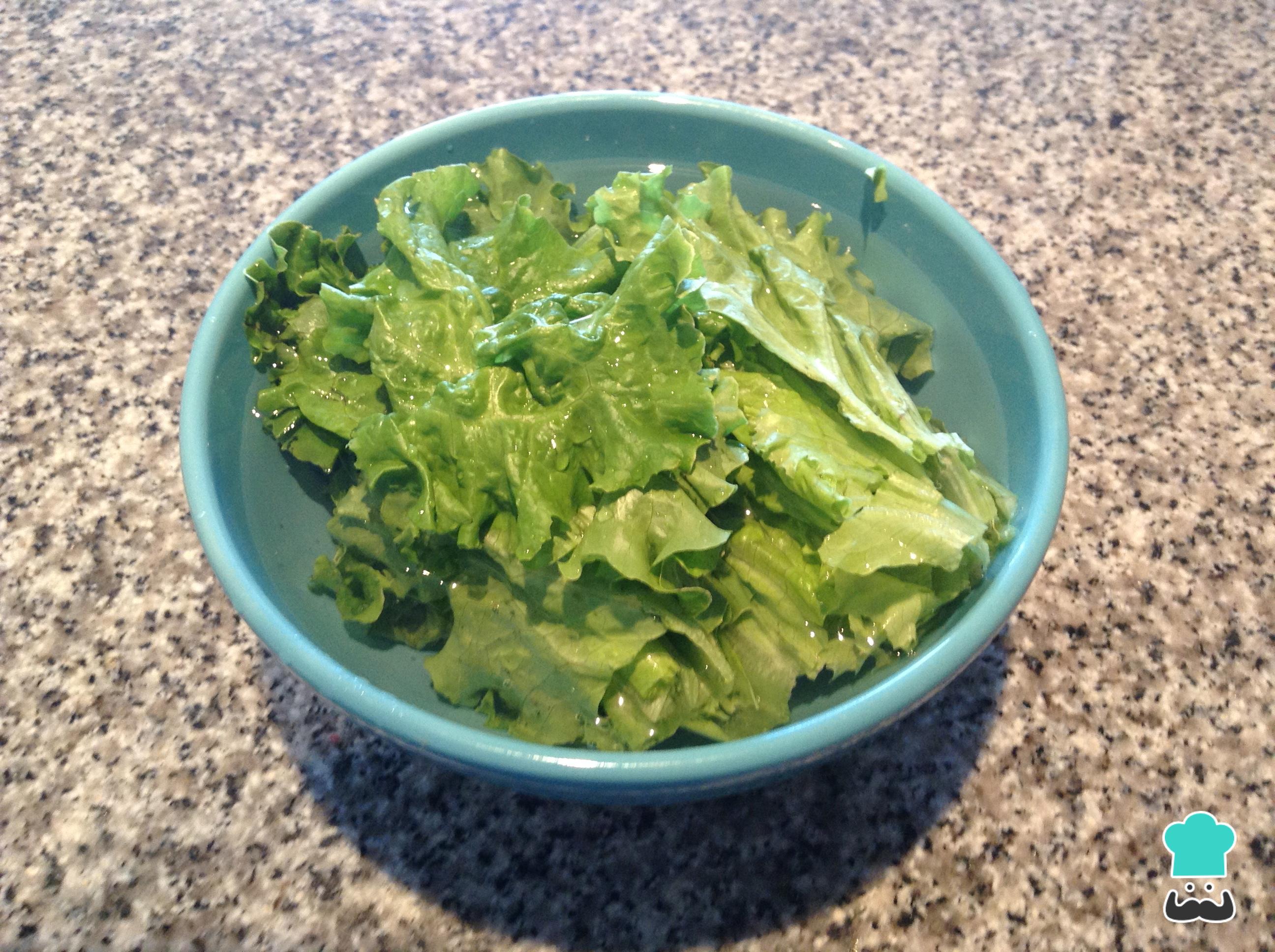 Para desinfectar la lechuga, la colocamos en un bol y la lavamos con agua y una cucharada de vinagre blanco. Dejamos en remojo durante 10 minutos y luego escurrimos bien.