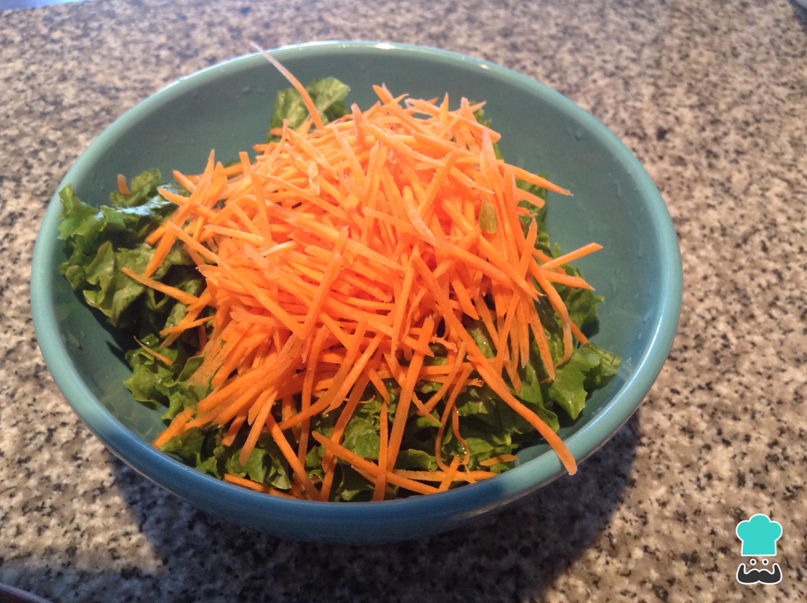 Ahora, para empezar a armar la ensalada de espárragos, colocamos la lechuga escurrida en la ensaladera y mezclamos con la zanahoria rallada.