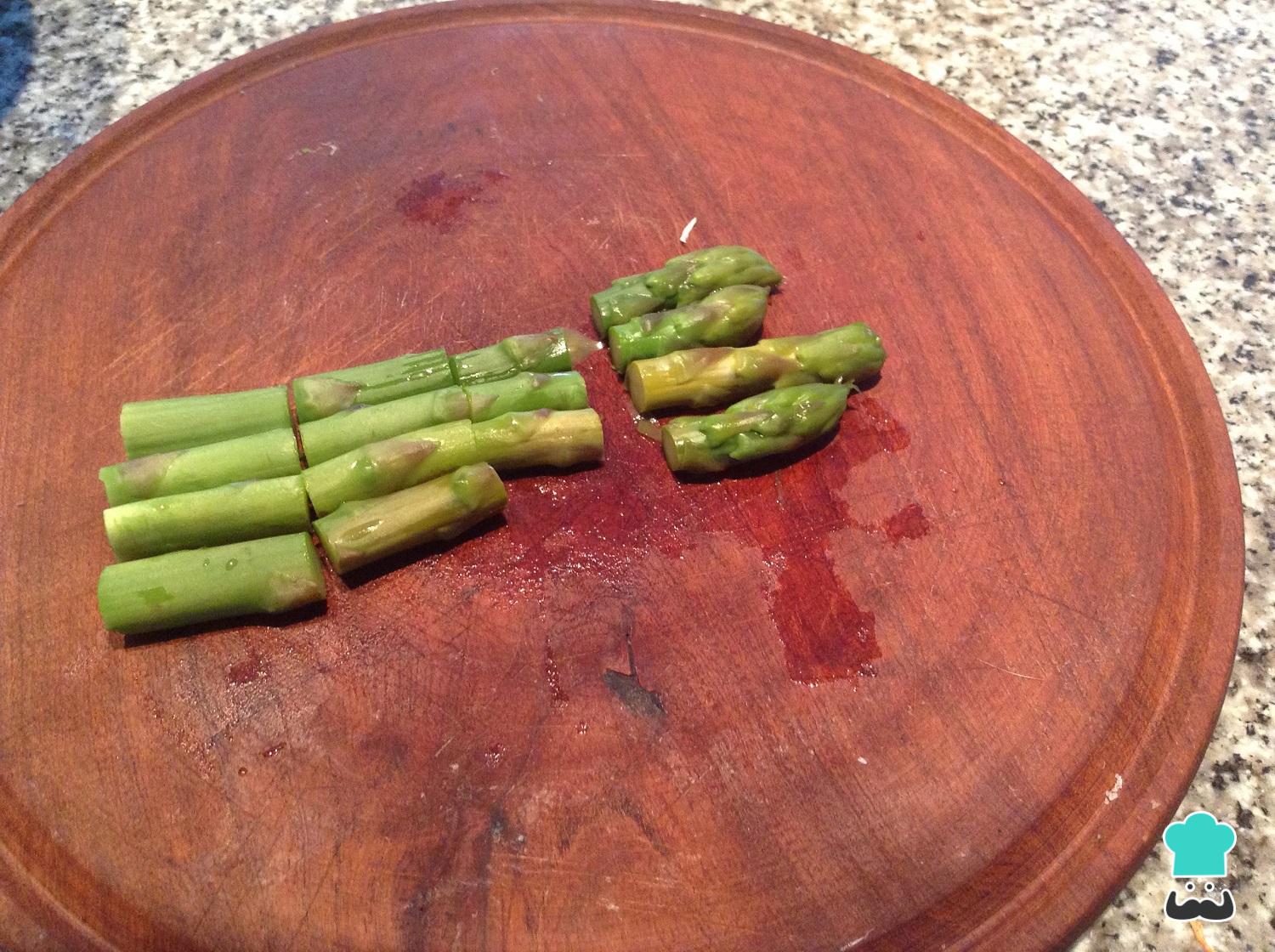 Para cocinar los espárragos, los colocamos en agua hirviendo durante 10 minutos máximo. Cuando estén listos, escurrimos y cortamos en trozos para luego mezclar con el resto de la ensalada verde.