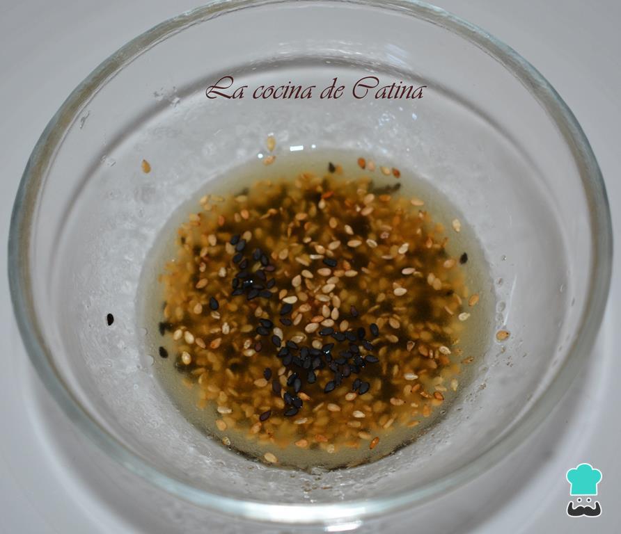 También preparamos el aliño de la ensalada de espárragos verdes: para ello mezclamos el chile cortado muy menudito, el aceite de sésamo, el aceite de oliva, el zumo de limón, las semillas de sésamo, las semillas de negrilla y la sal al gusto.