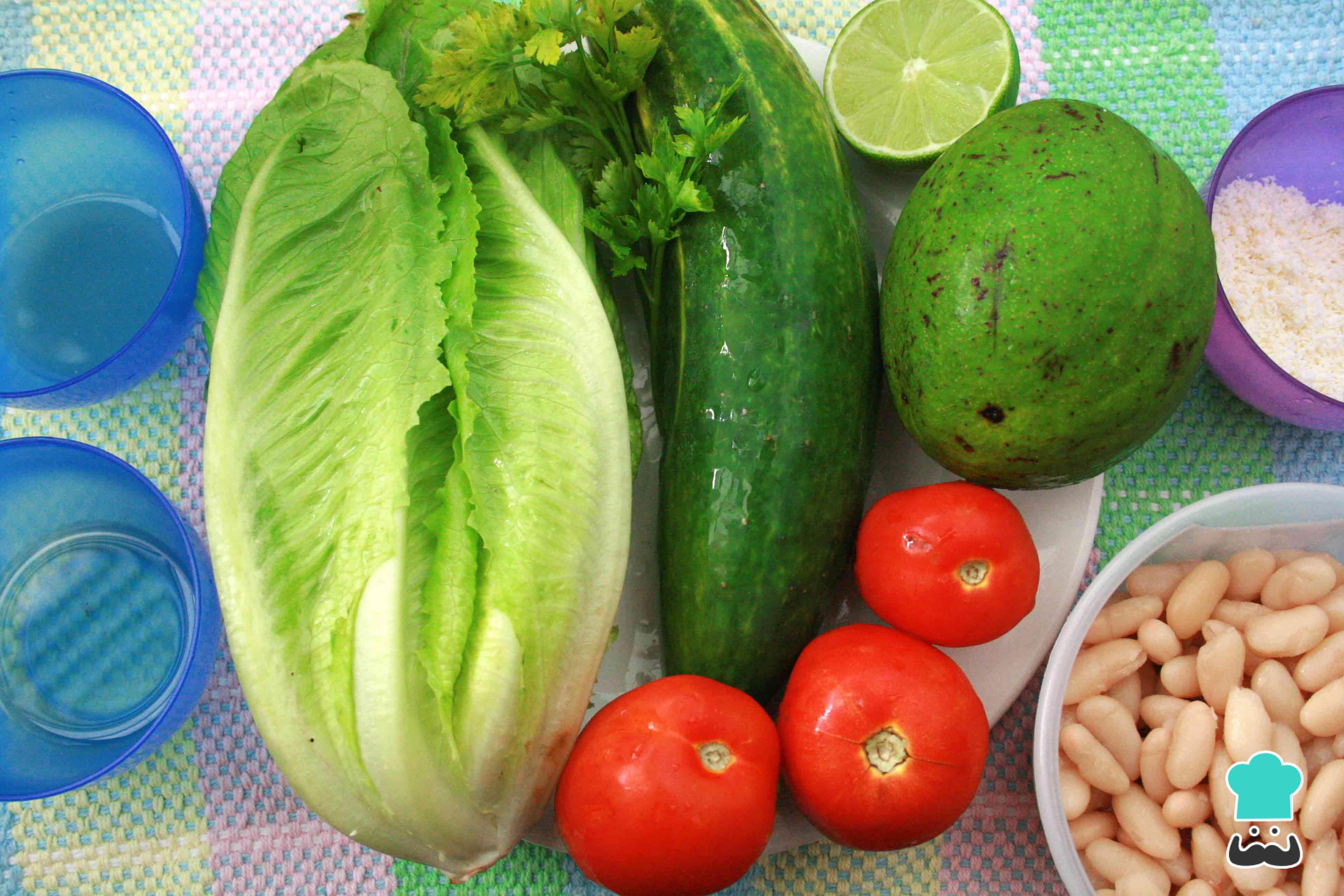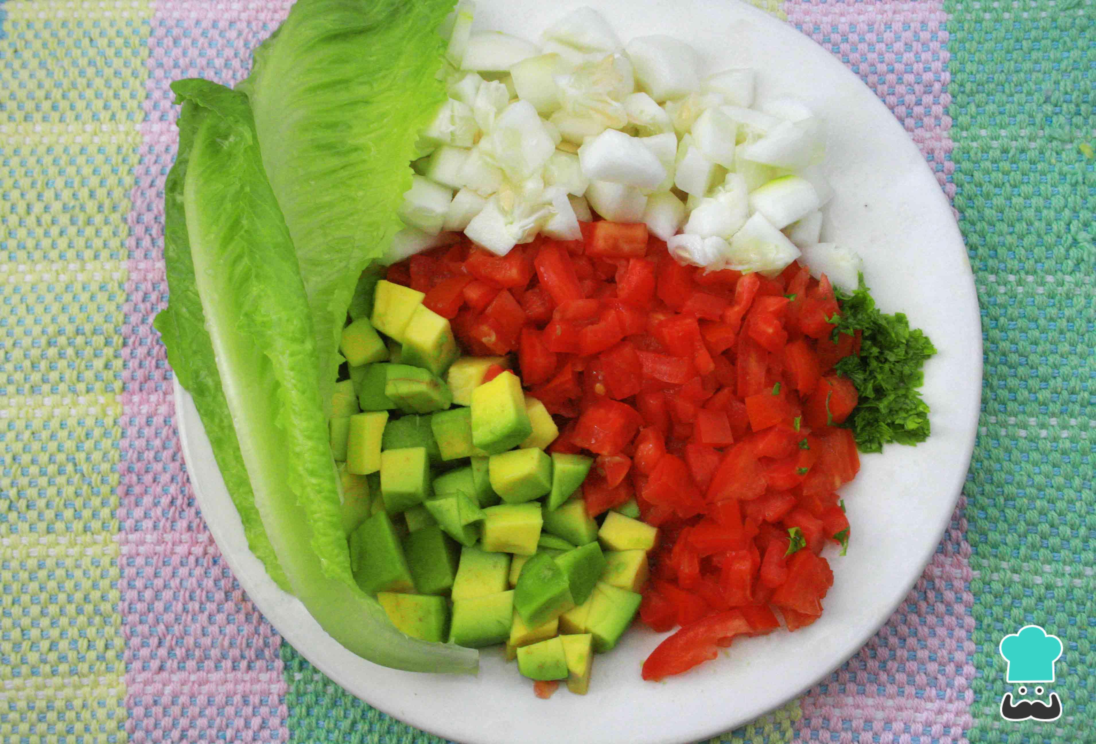 Corta en cubos pequeños todos los vegetales menos la lechuga y reserva. la lechuga puedes picarla en juliana, reservando una hoja de lechuga entera. ¡Nada como una refrescante ensalada con aguacate y frijoles!