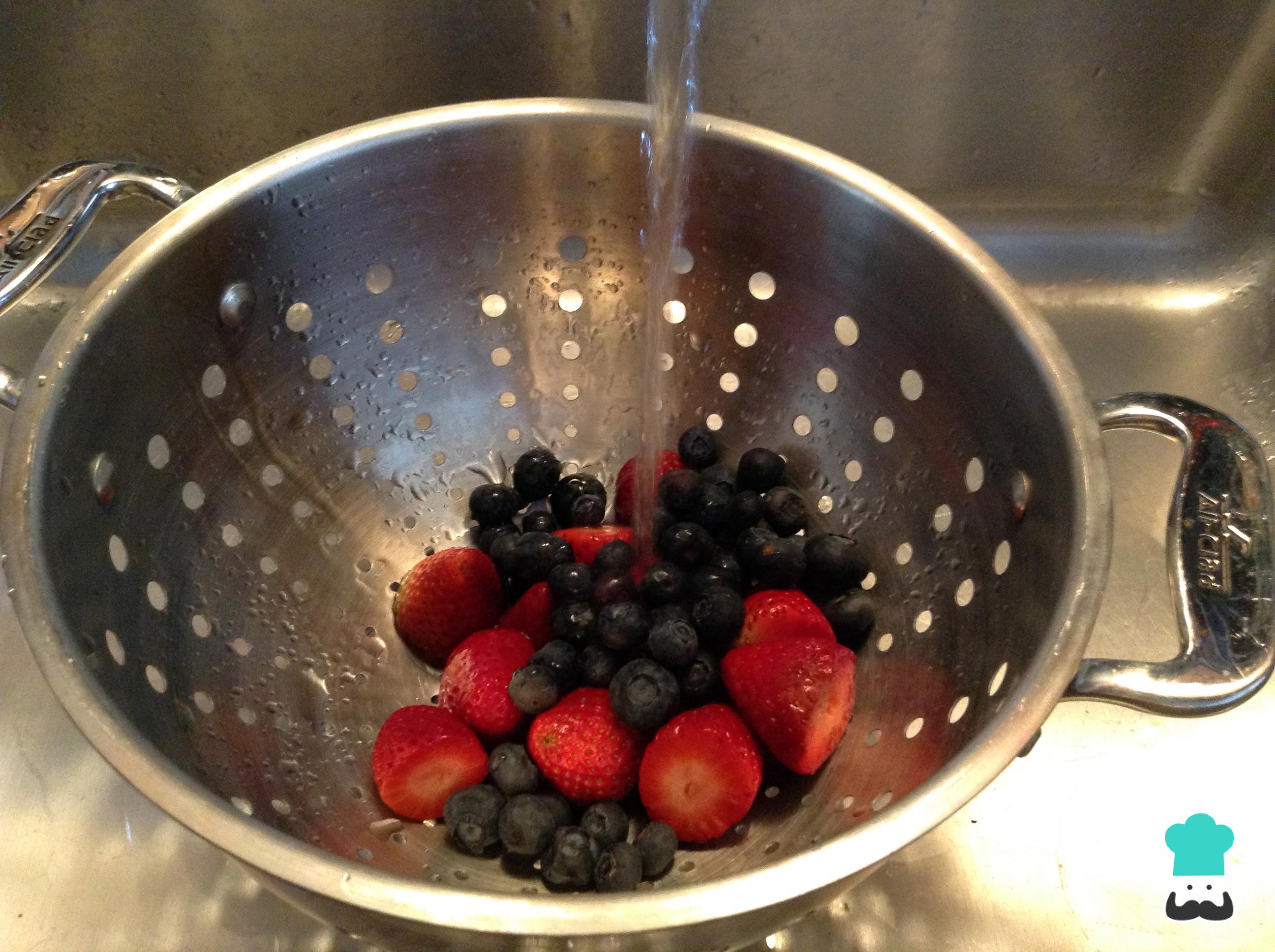Adicionar las fresas y los arándanos en un colador.Lavarlos bien.Dejarlos escurrir.