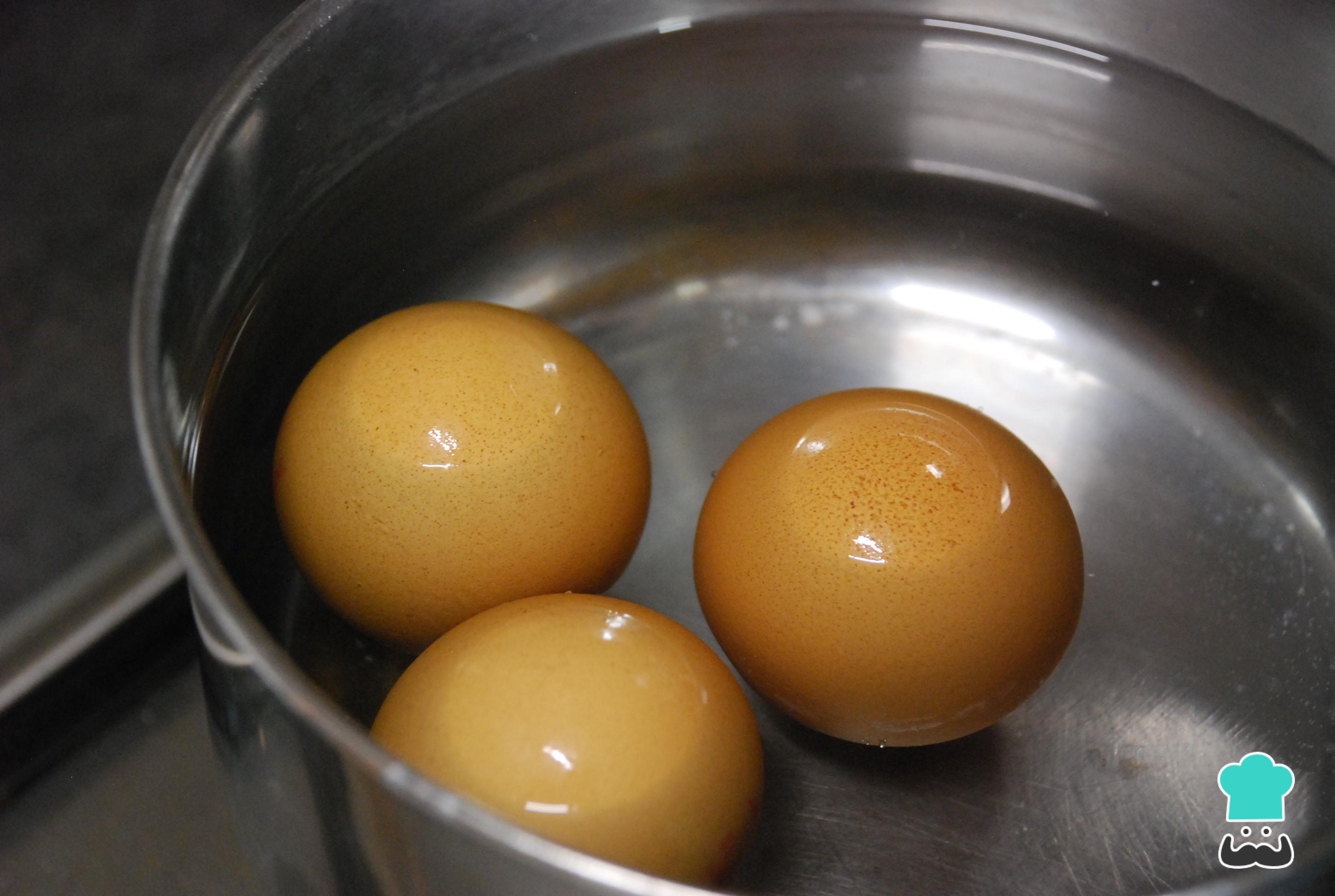 Para cocer los huevos, calienta una olla con suficiente agua y cuando rompa el hervor añade los huevos con cuidado. Baja ligeramente la temperatura y deja que se cocinen por 10 minutos. Añade un poco de sal y vinagre para que los huevos duras se pelen con mayor facilidad.