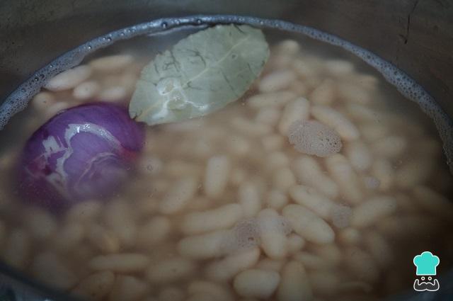 Si queréis cocer vosotros las alubias, las dejáis 12 horas en remojo. Luego, las ponéis en una olla cubiertas de agua con una cebolla y una hoja de laurel, y las tenéis cociendo hasta que queden tiernas.