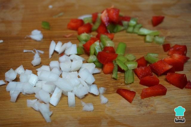 Picamos todas las verduras en trozos pequeños: el pimiento rojo, pimiento verde y la cebolleta.