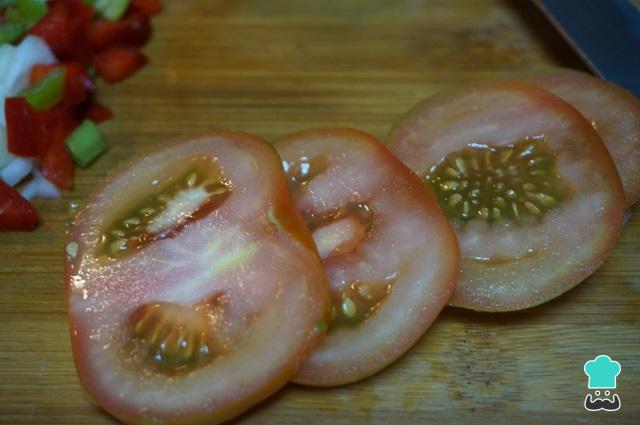 Cortamos los tomates en rodajas o en trozos pequeños, como más nos guste la ensalada de alubias blancas.