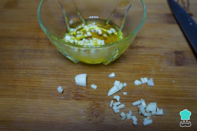 Preparamos el aliño. Para ello, en un bol ponemos el aceite de oliva, picamos 1-2 dientes de ajos muy pequeñi y los añadimos.