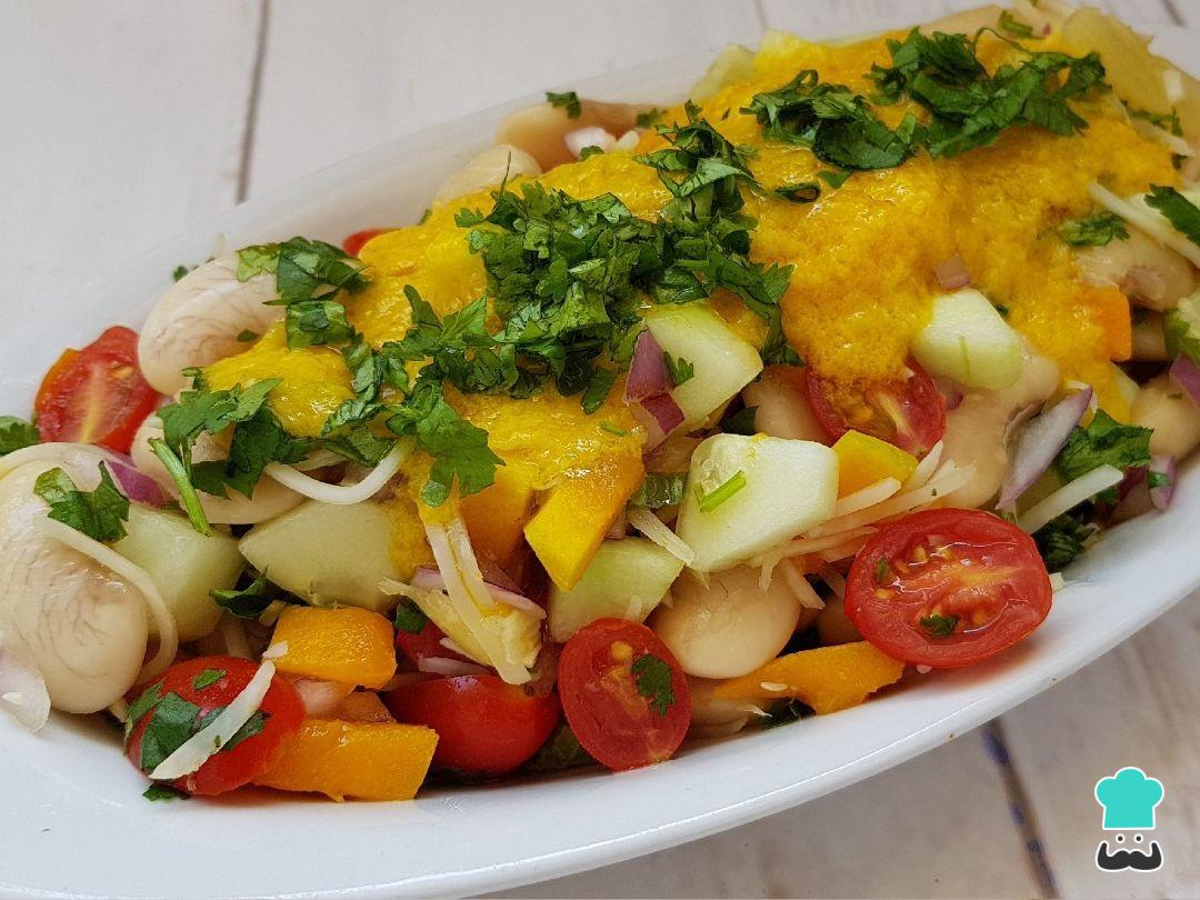 Para preparar esta ensalada fría que traigo a RecetasGratis he utilizado los judiones, judias blancas de fabada o de la Granja. Es una receta fresca y veraniega, puesto que combina verduras hidratantes como tomates cherry, pepino, y frutas tropicales y jugosas tales como piña y mango. Vamos a servir la ensalada de judiones con una vinagreta de mango que aportará un toque agridulce al plato.