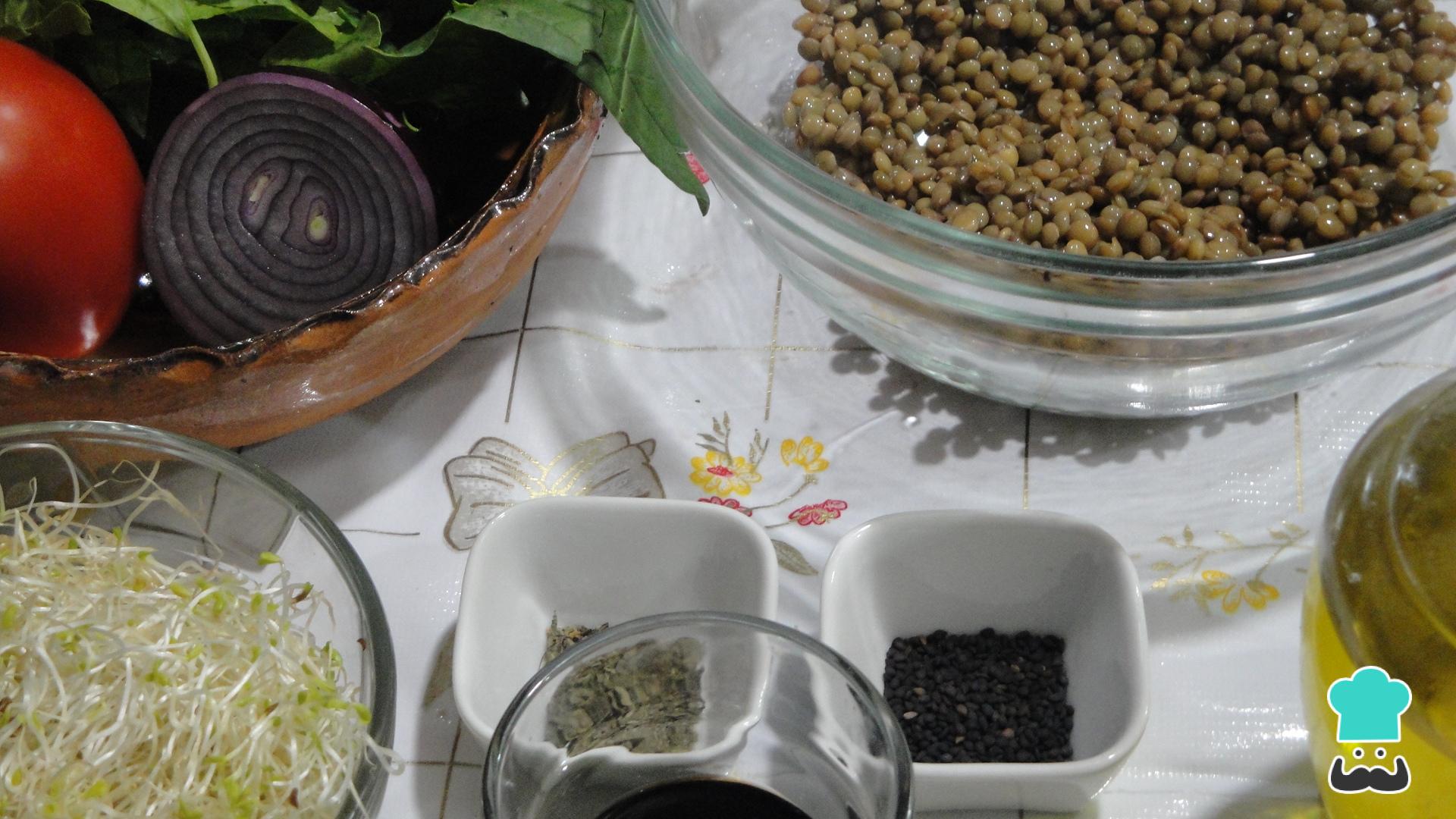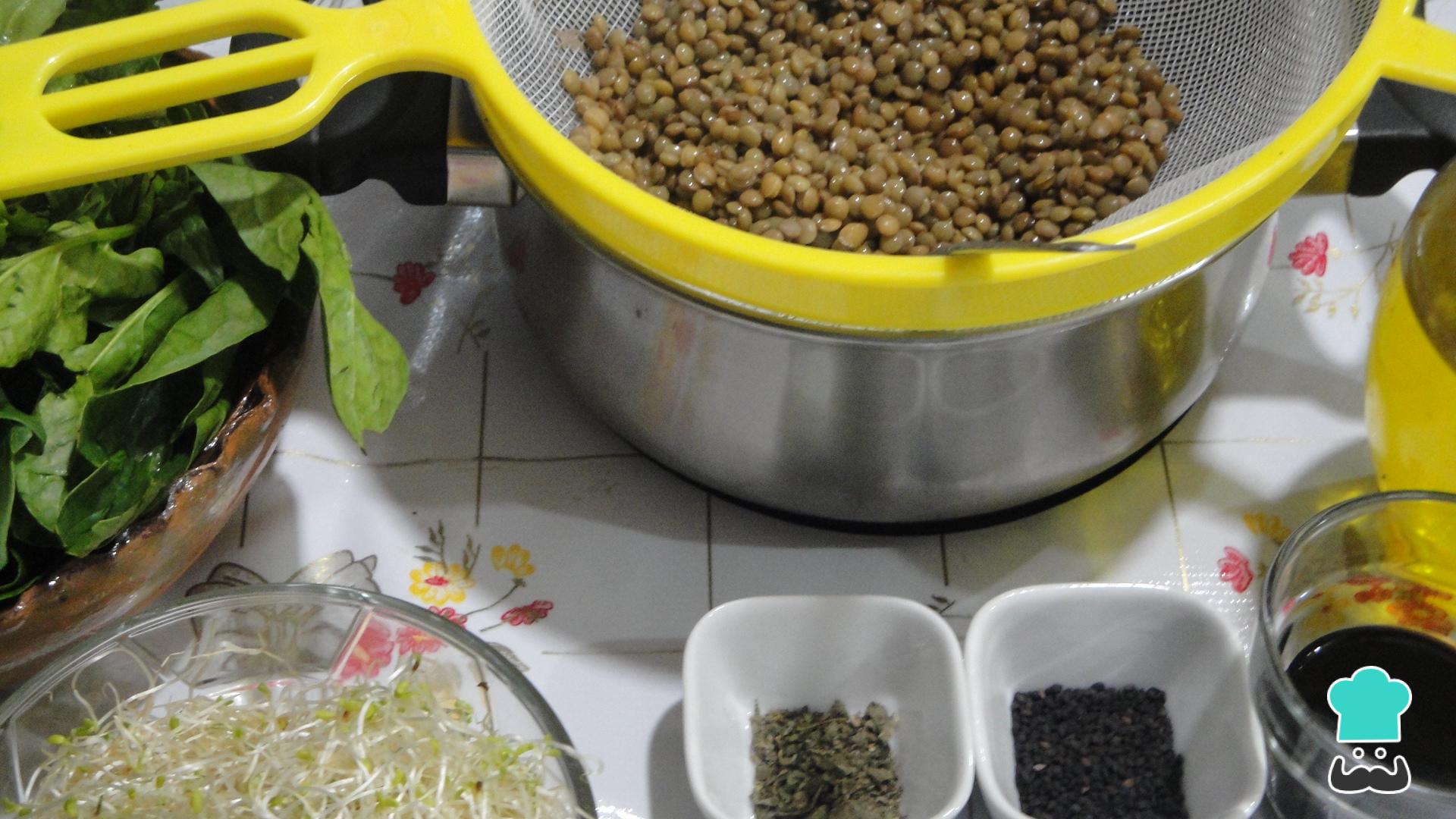 Como primer paso, reunimos todos nuestros ingredientes. Limpiamos las lentejas, las lavamos y ponemos en remojo por dos horas. Lavamos y desinfectamos las espinacas y el germinado de alfalfa. Una vez que estén desinfectados, dejamos que se escurran en una coladera.