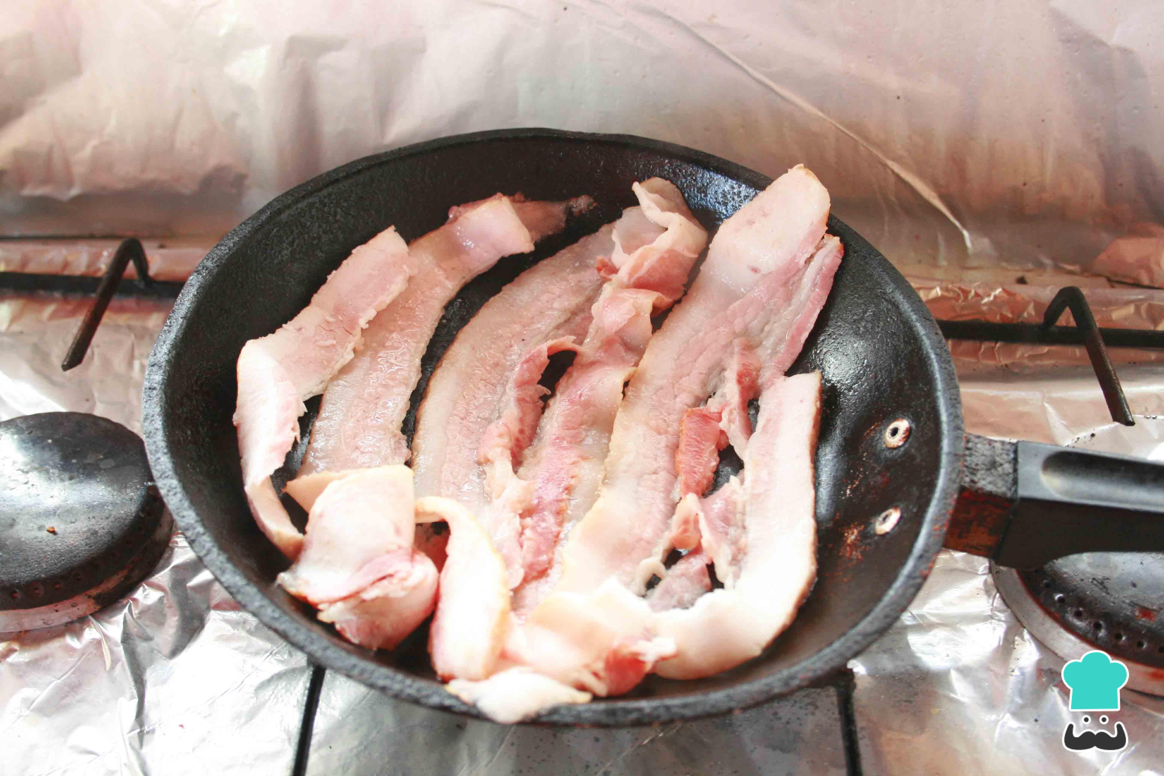 En un sartén dora el tocino. Aplica fuego medio-alto. Escurre la grasa, enfría y desmorona.