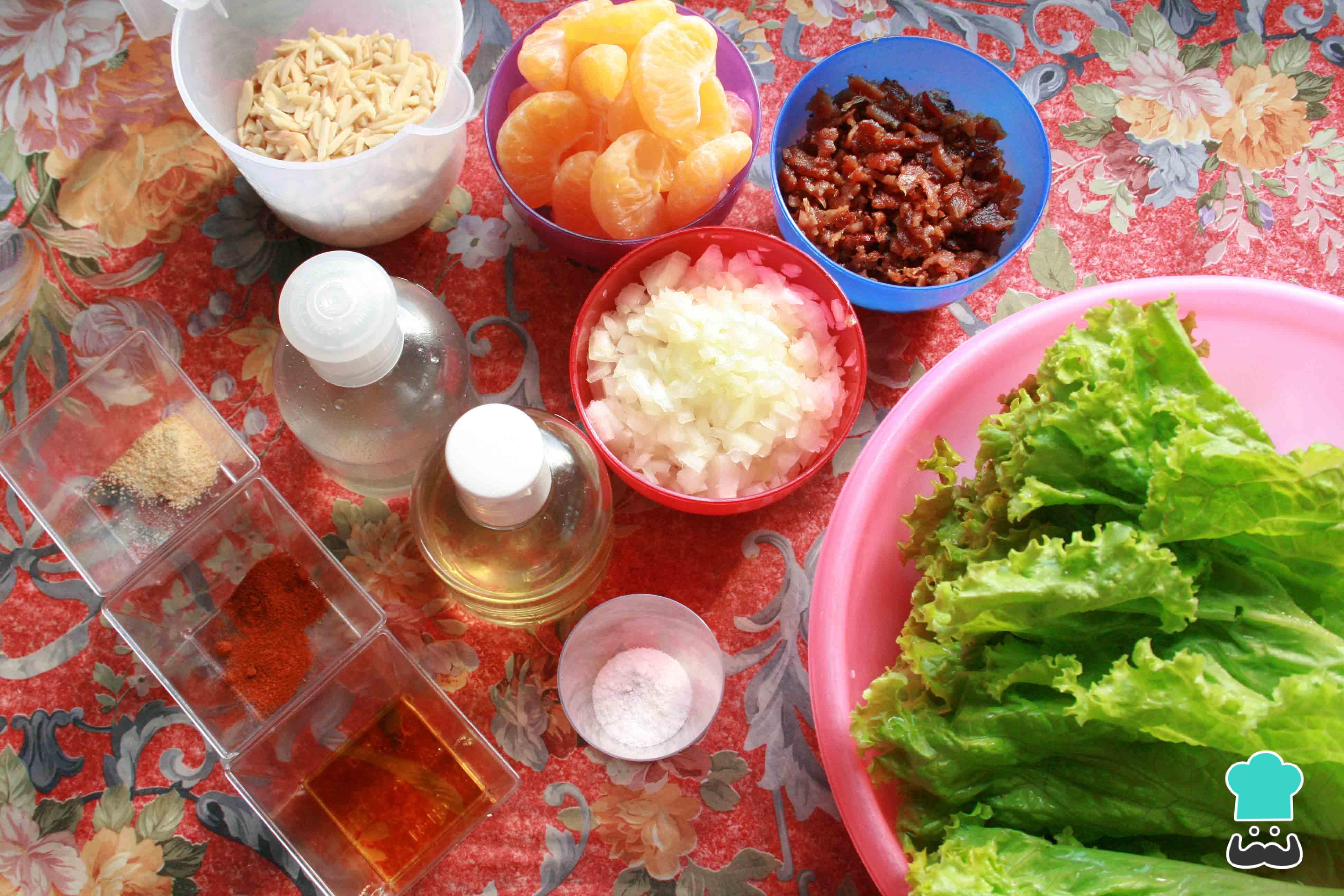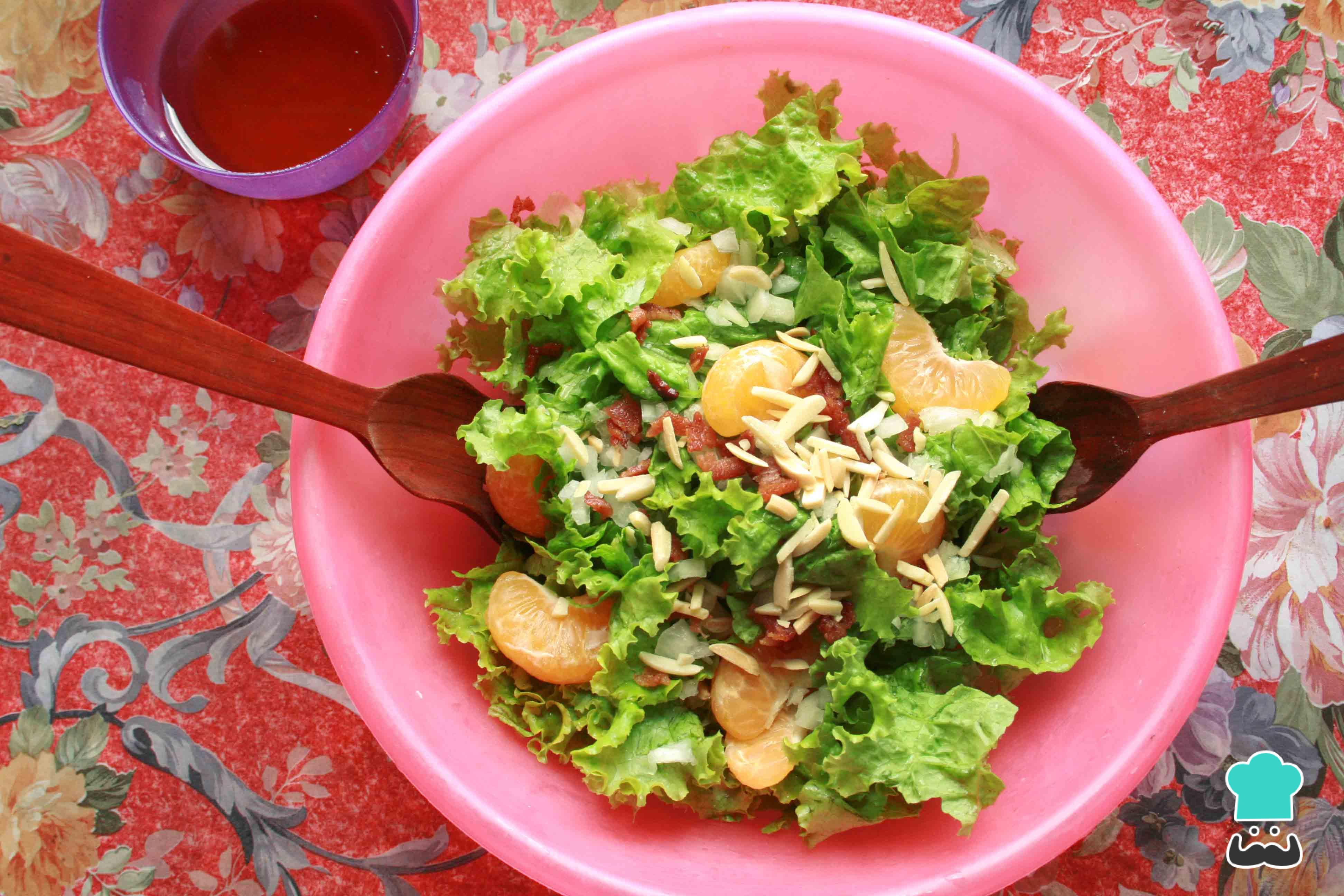 Coloca las hojas de lechuga, la mandarina, la cebolla (preferiblemente cambray), el tocino y la almendras en una ensaladera. Mezcla con cuidado y añade el aderezo. Emplata y sirve.