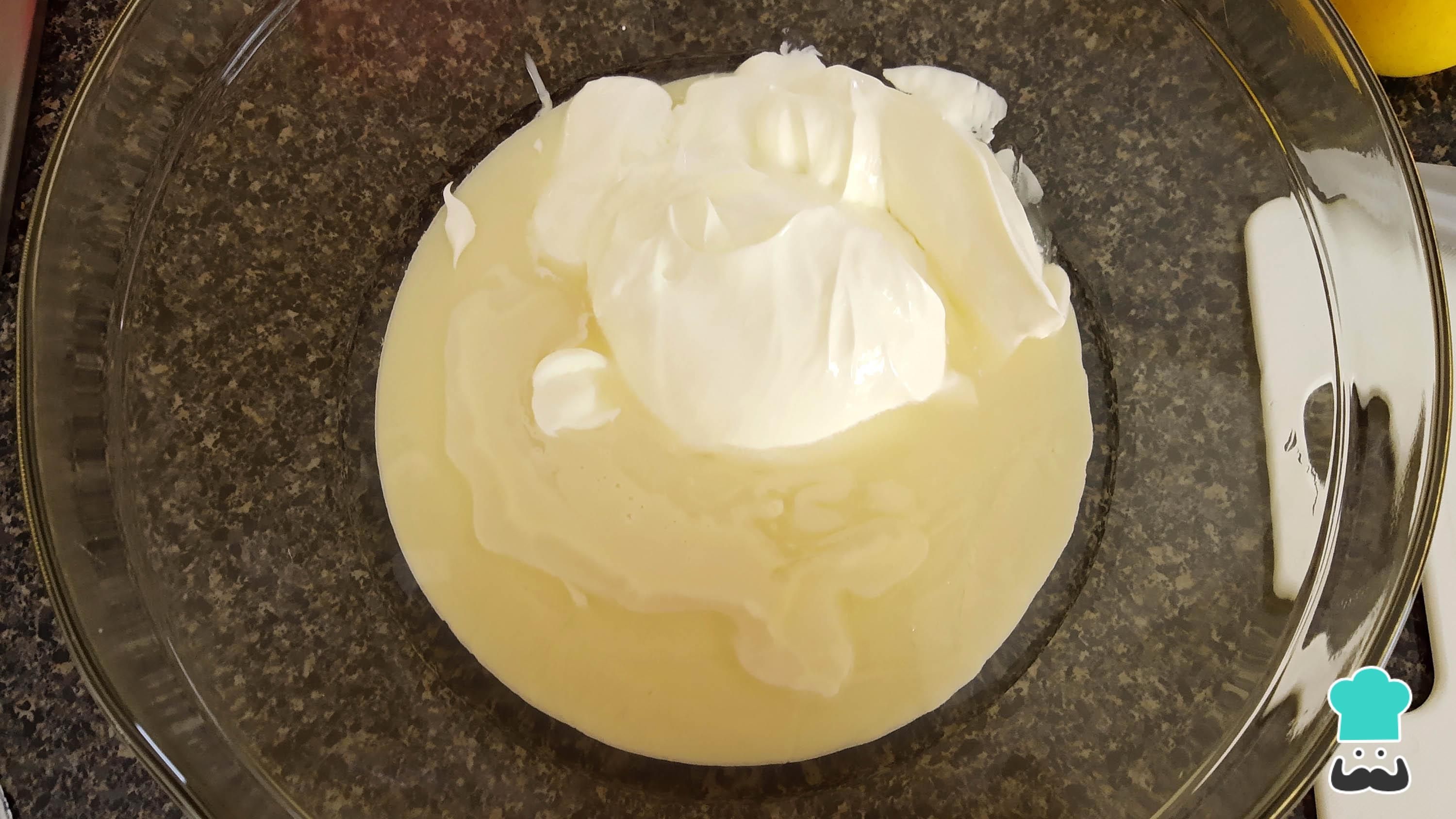Para comenzar la receta de ensalada de manzana y nueces, prepara el recipiente donde harás la ensalada. Asegúrate de que sea grande y amplio. En él, vacía la media taza de almíbar del durazno, la crema ácida y la leche condensada y mezcla hasta lograr que se integre todo.