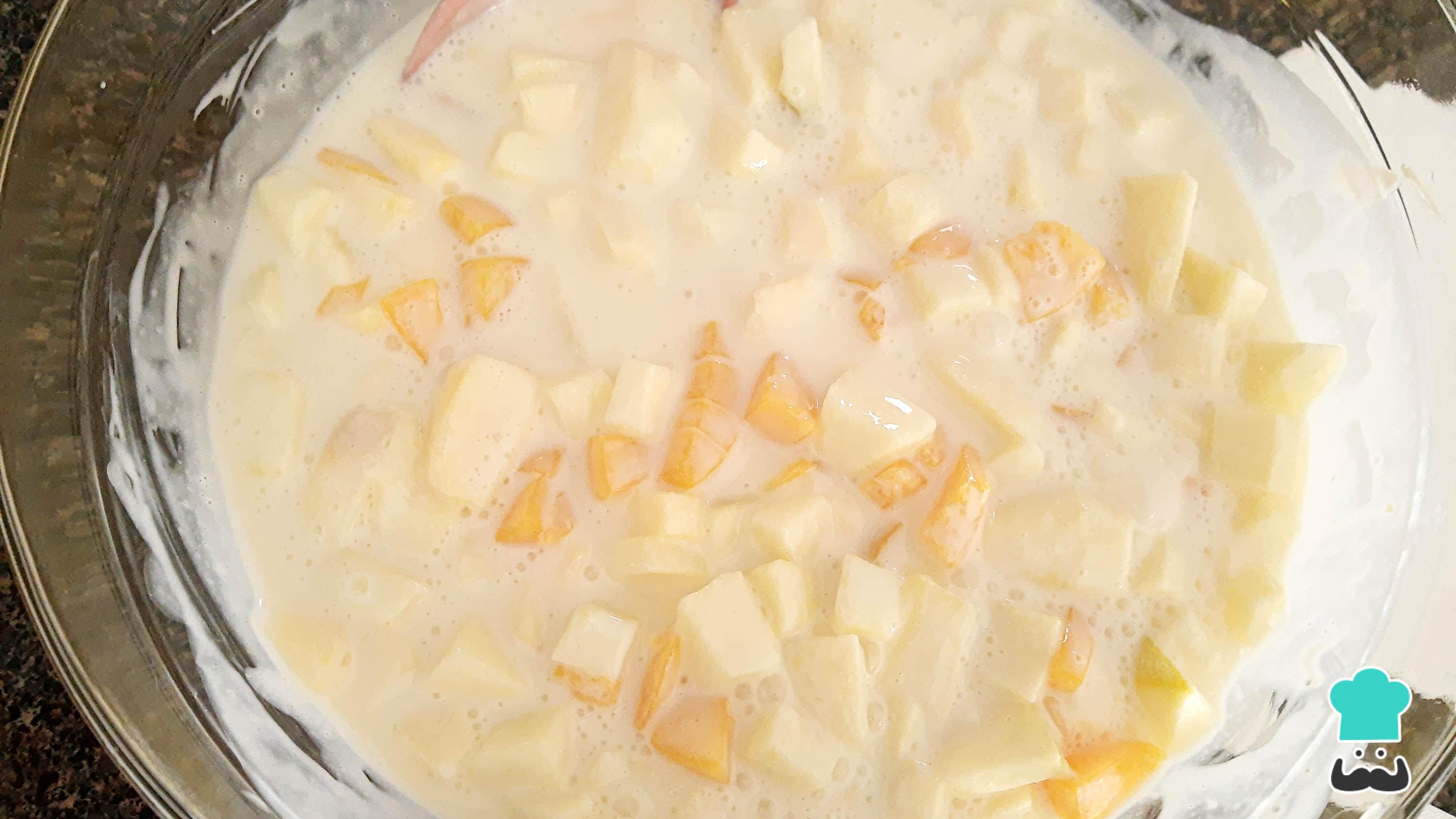 Pela la manzana y pícala en cuadritos de tamaño similar al de los duraznos, ve agregándola al recipiente de la crema y mezcla.