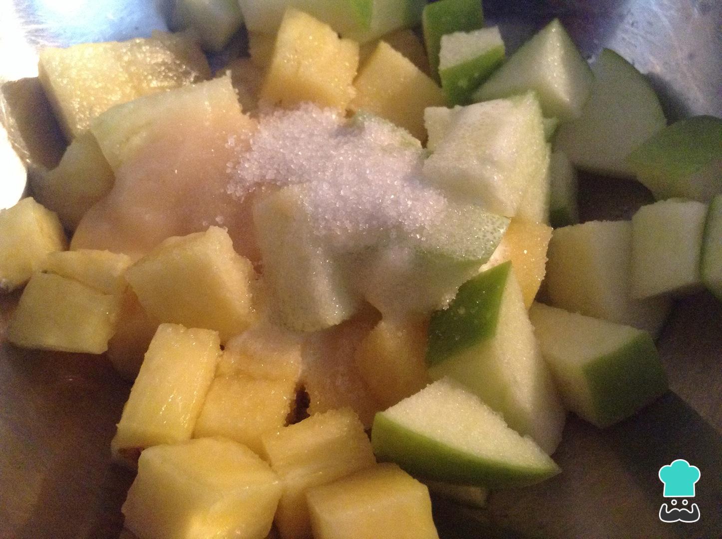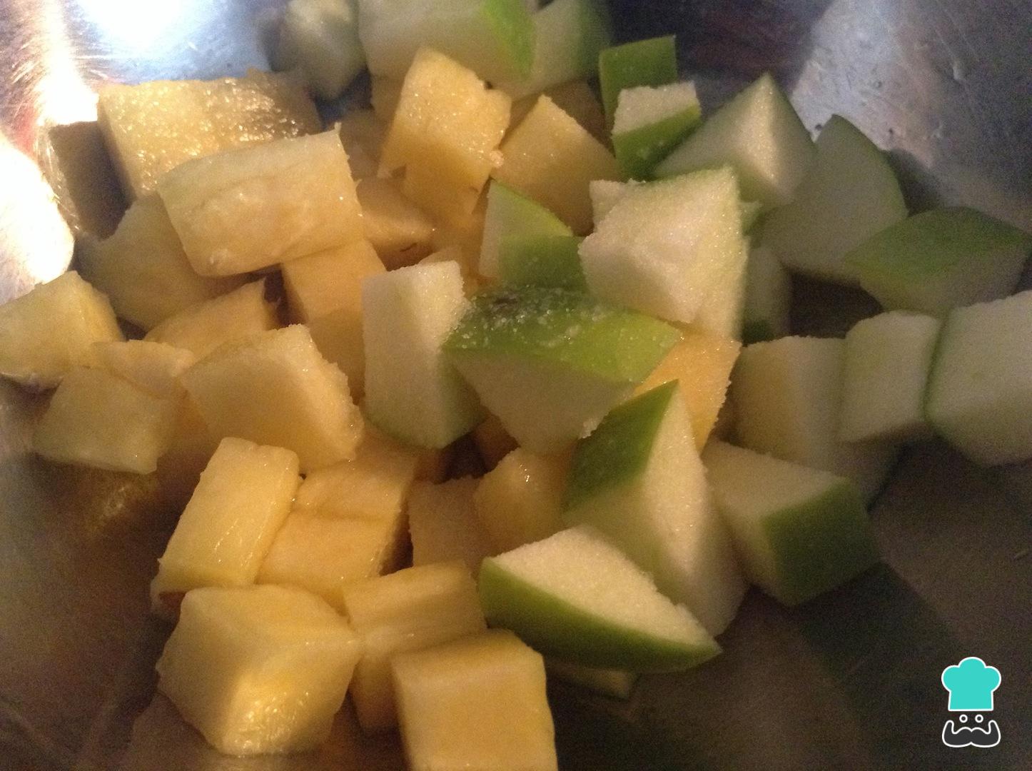 Pela la piña y cortarla en cuadros medianos, si deseas puedes utilizar piña que viene en lata. Haz lo mismo con la manzana la que podrás dejarle la cáscara si deseas. Lleva esto a un bol y añade un poco de sal para evitar que la manzana se oxide.