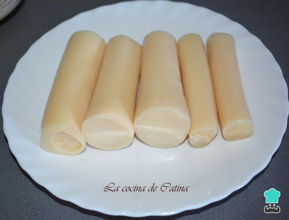 Empezamos por escurrir muy bien y trocear en rodajas los palmitos para colocarlos en una fuente o ensaladera.