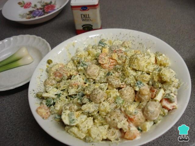 Añadir la salsa mayonesa y remover la ensalada de pasta y papa con cuidado para no triturar los tubérculos.