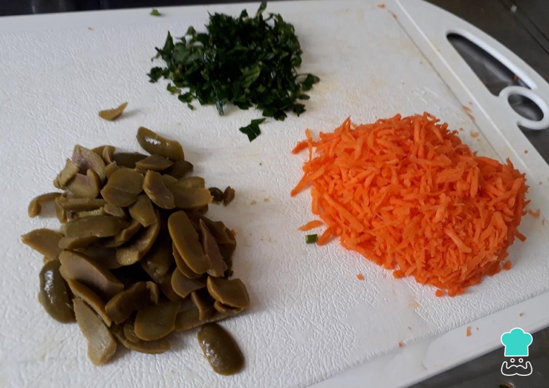 A continuación, preparamos el resto de ingredientes. Así, picamos el perejil, las aceitunas y rallamos la zanahoria.