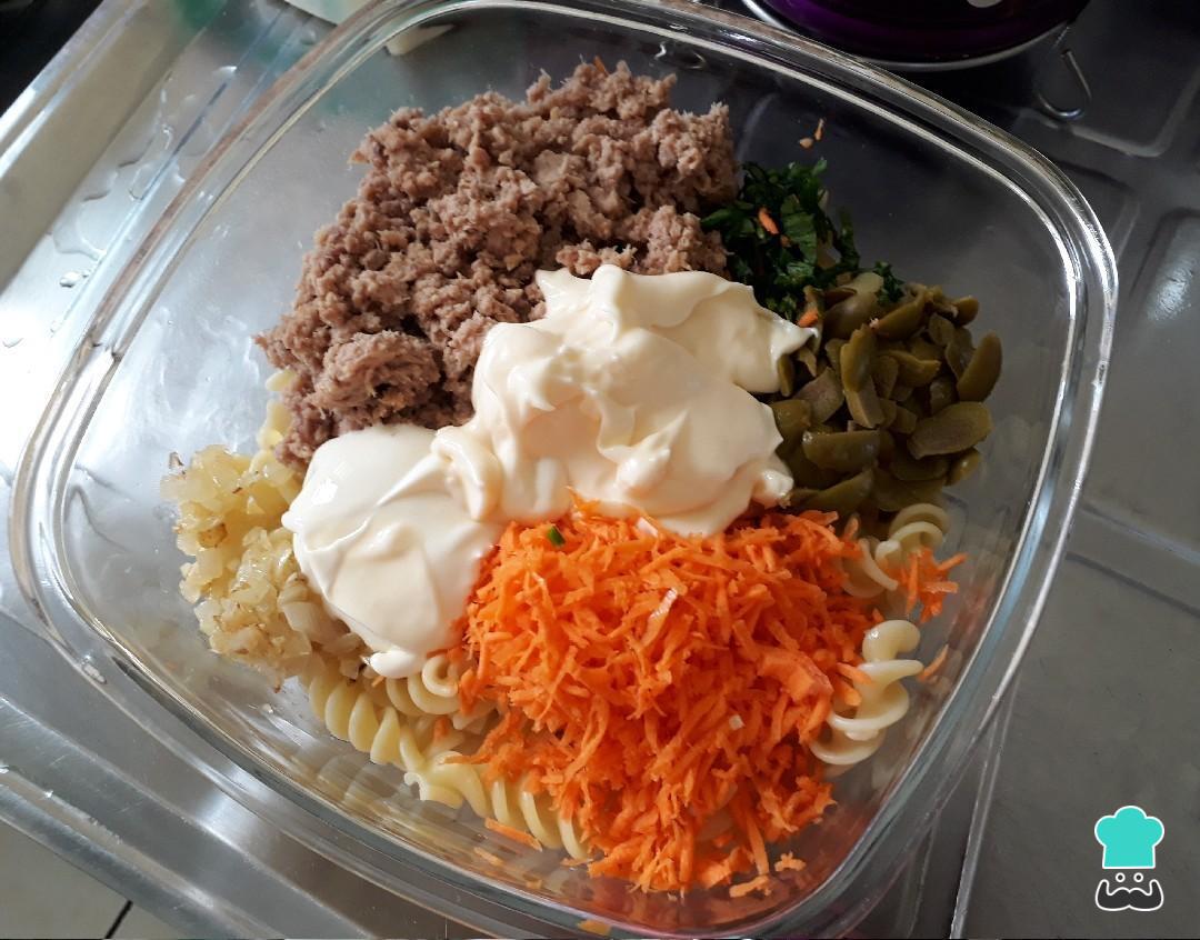 En un reciìente colocamos la pasta cocida, el sofrito de cebolla y ajo, el perejil, la zanahoria, el requesón, las aceitunas y la mayonesa, y mezclamos todo. Si queremos, podemos sustituir la mayonesa por salsa rosa, ya que esta ensalada de pasta con atún y cebolla se presta a ambas opciones. Así mismo, podemos hacer nuestra propia salsa rosa mezclando mayonesa con kétchup.