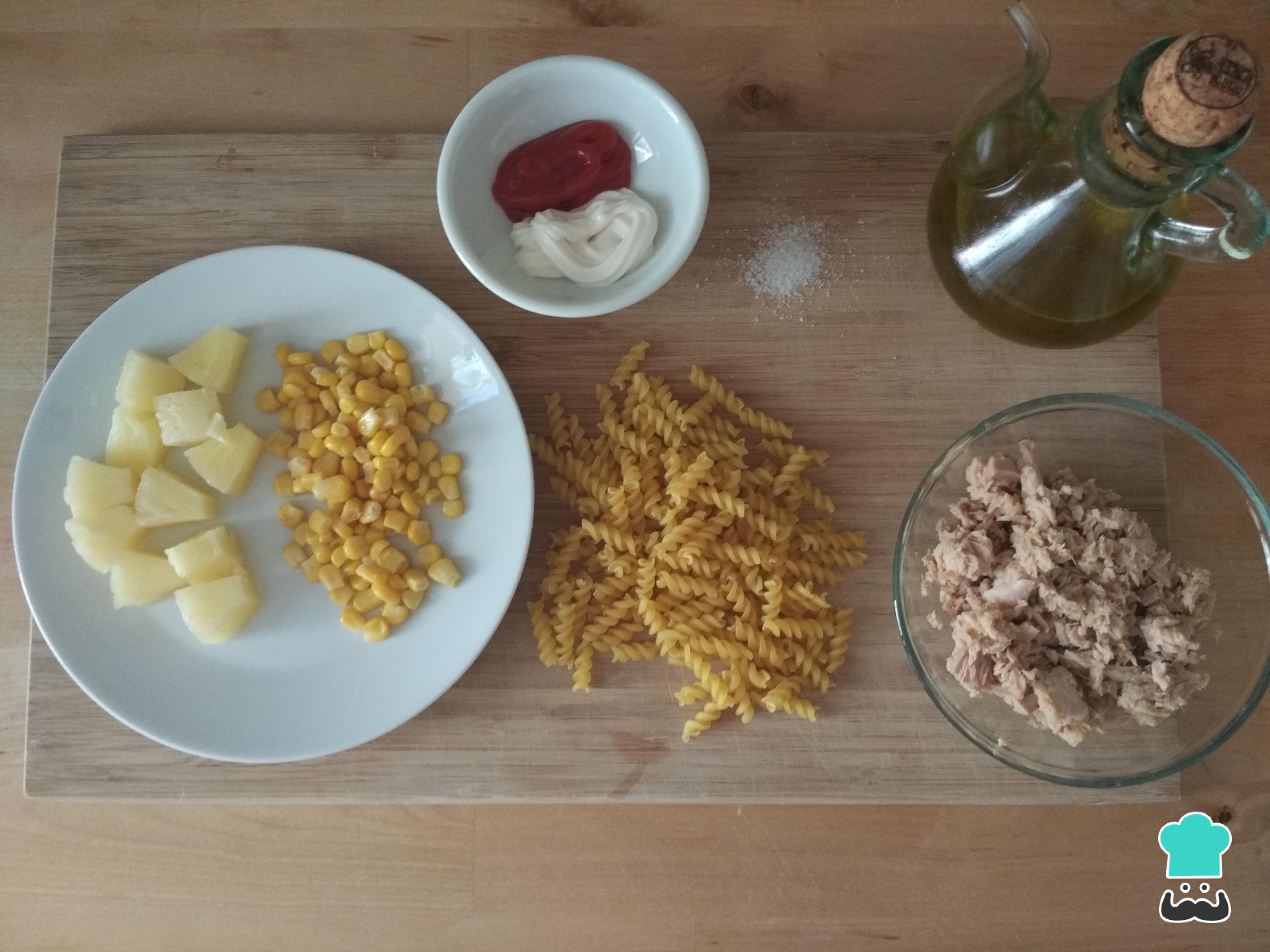 Reunimos todos los ingredientes para preparar la ensalada de pasta con piña y atún.
