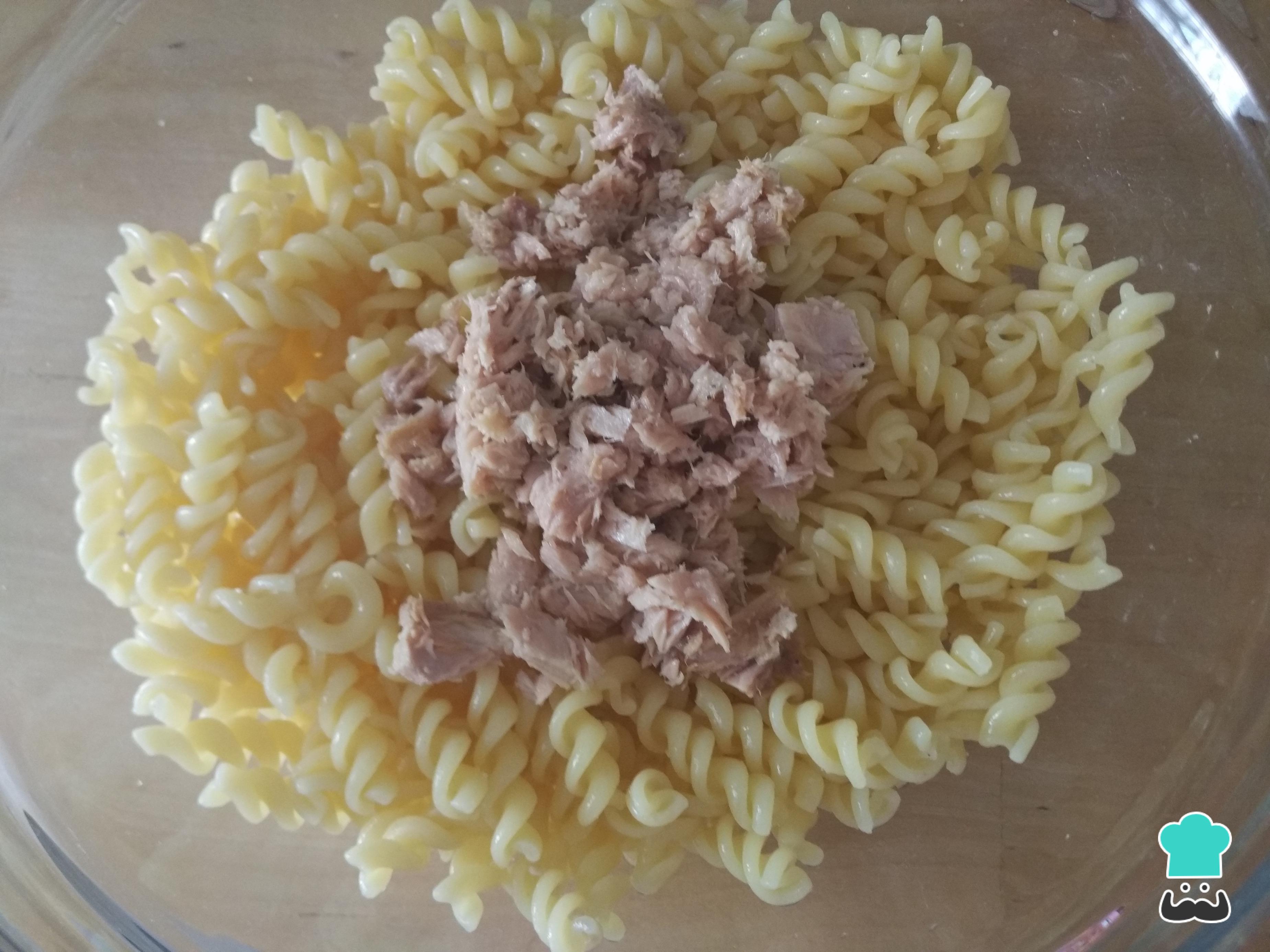 Colocamos la pasta en una ensaladera y agregamos el atún escurrido por encima.