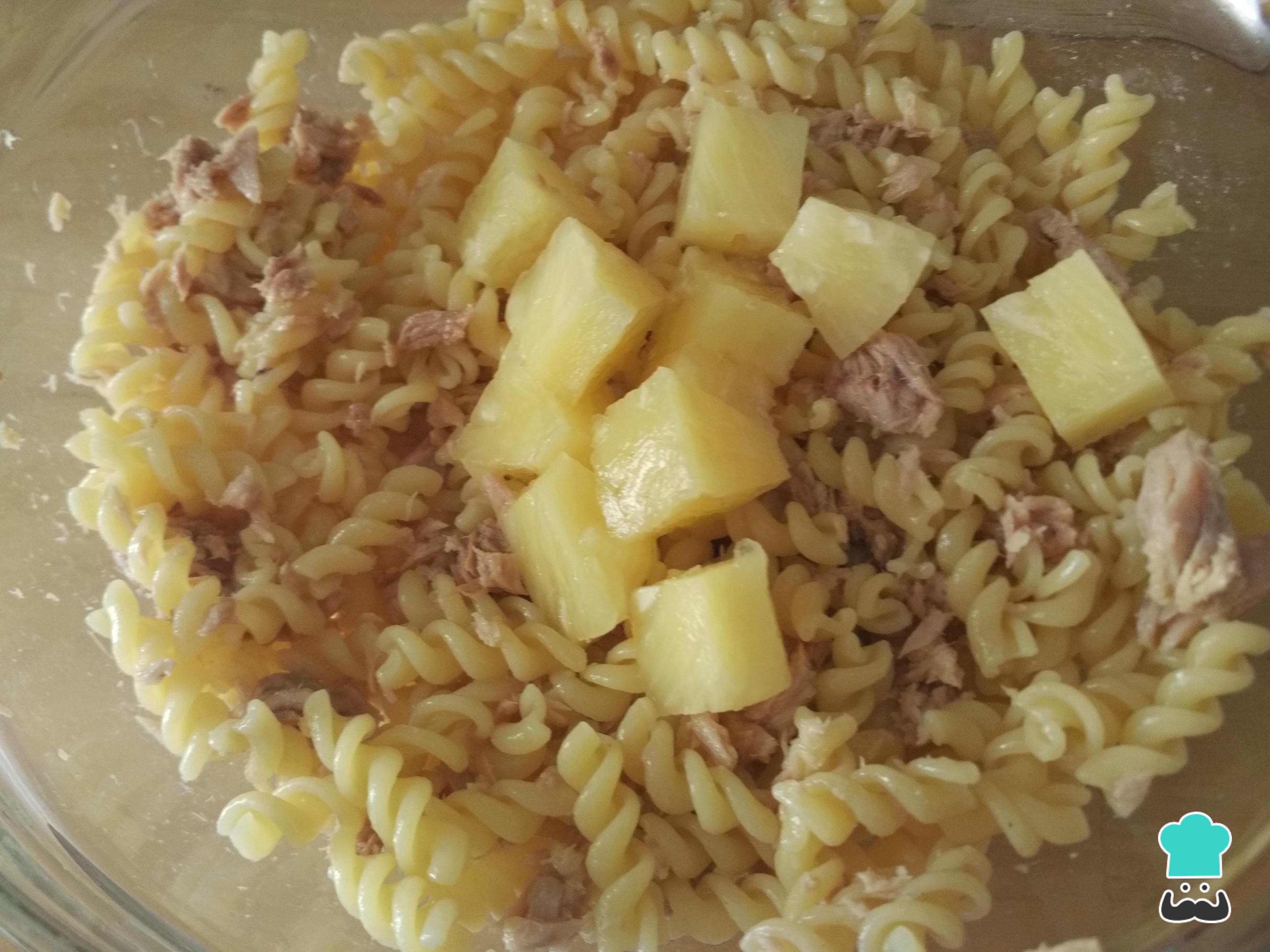 Para continuar con esta ensalada de pasta, incorporamos la piña cortada en trozos. Para esta receta hemos usado piña en conserva, pero la piña natural es también perfecta para esta ensalada fría. Además, es un alimento muy diurético.