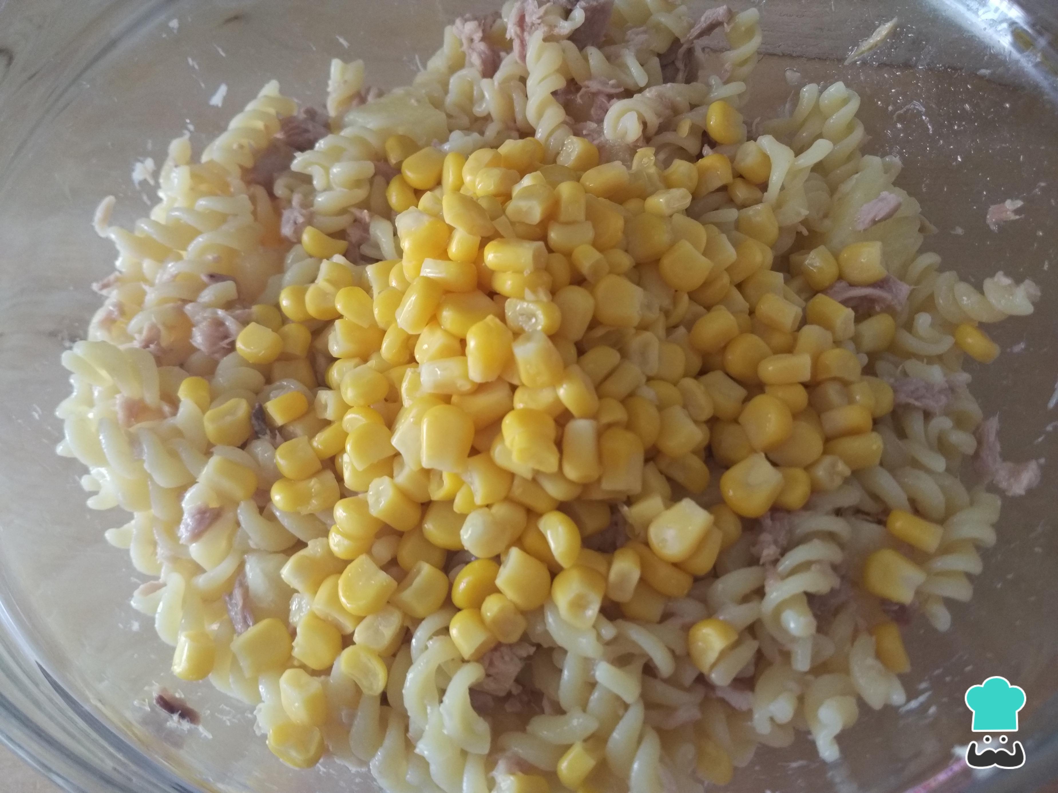 Ahora agregamos el maíz dulce que previamente hemos lavado y escurrido. En esta ensalada de pasta el maíz combina muy bien con el resto de sabores.