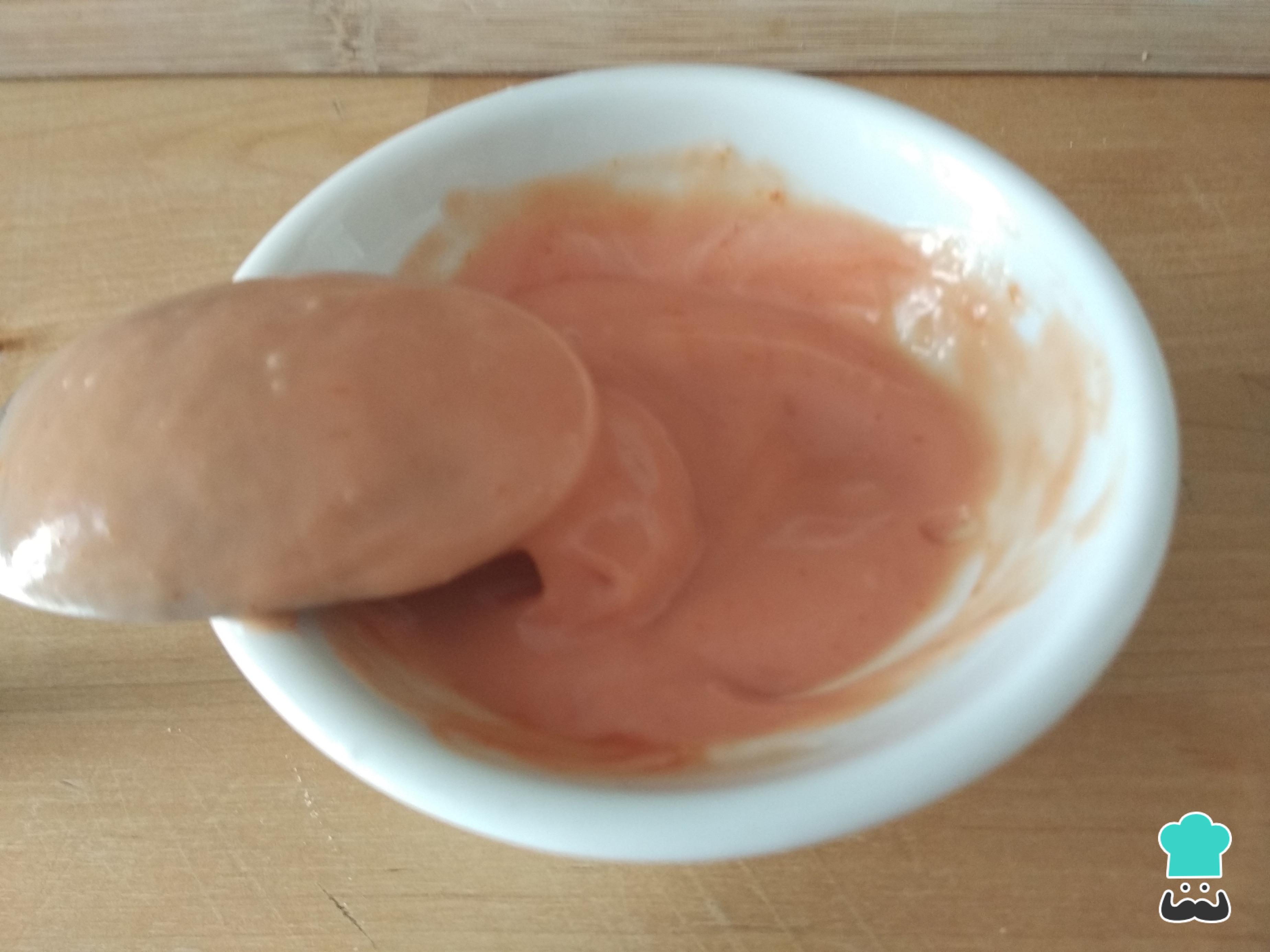 Para aderezar la ensalada de pasta con piña y atún, mezclamos ketchup y mayonesa en un bol y movemos bien para que quede una salsa rosa ligera y homogénea.