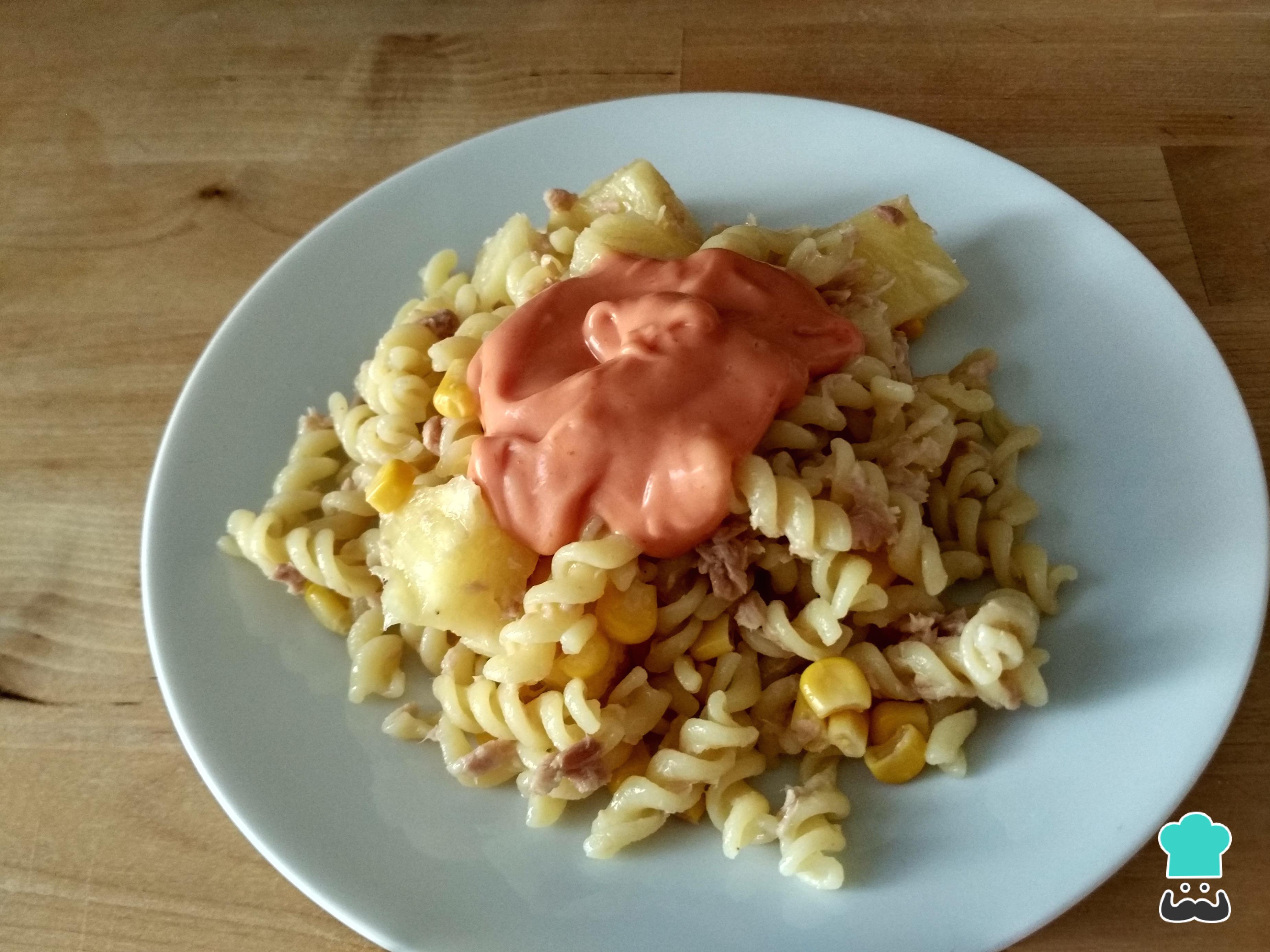 La receta de ensalada de pasta con piña y atún también se puede aderezar con un poco de sal y aceite de oliva si queréis que sea más ligera.