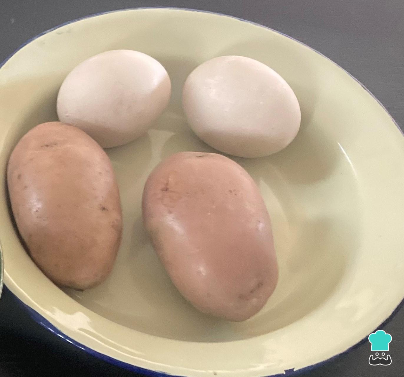 Lava las papas y los huevos y cuece ambos ingredientes en una olla con agua y sal. Deja cocinar a fuego medio durante 10 min los huevos y de 30 a 45 minutos las papas.