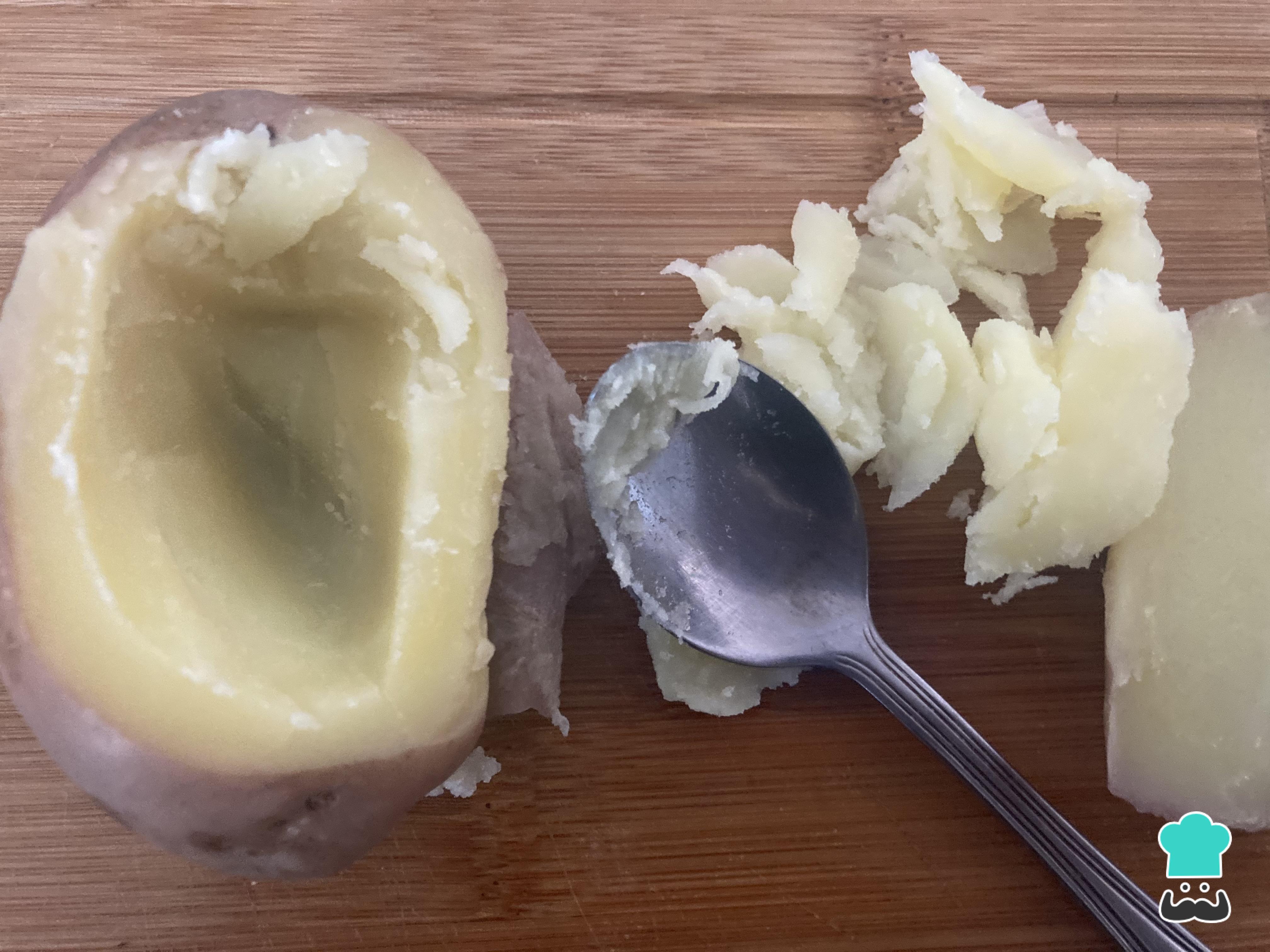 Cuando las papas estén listas, deja que se enfríen, córtalas por la mitad a lo largo y saca parte del interior con ayuda de una cuchara. Así, obtendrás unas canoas de papa. Salpimienta al gusto y resérvalas.