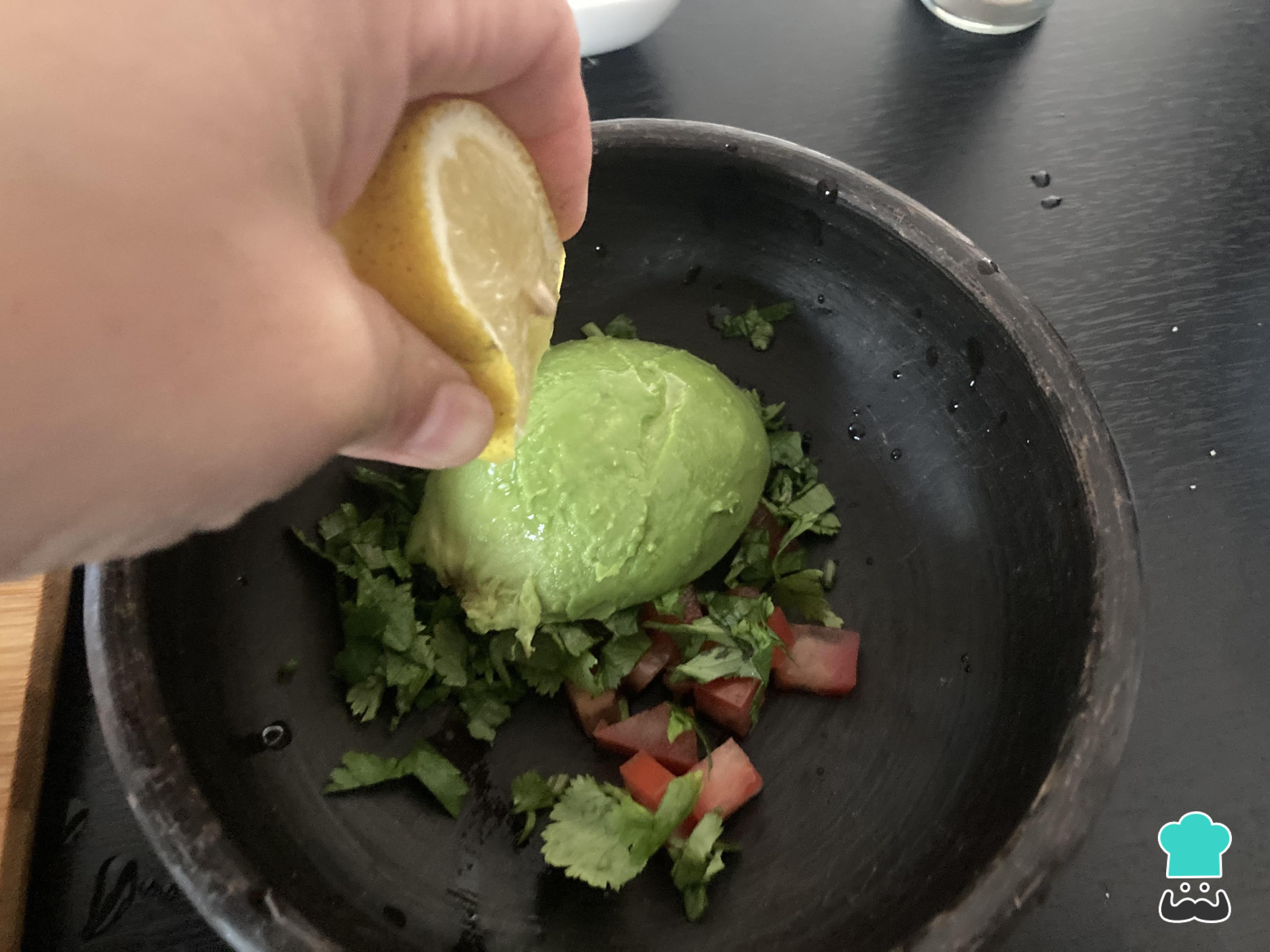 Pica el cilantro bien pequeño, corta el tomate en cubos y aplasta la carne de la palta (aguacate) con ayuda de un tenedor. Mezcla todos estos ingredientes y agrega sal, pimienta y un chorro de jugo de limón al gusto.