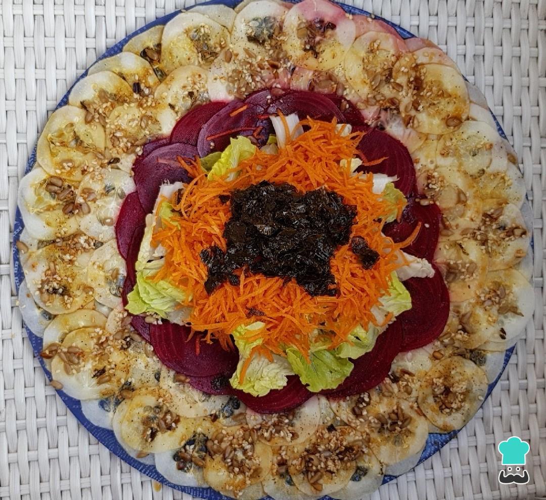 Cuando tengas todas las preparaciones listas monta la ensalada de pepino, zanahoria y remolacha. En el centro de un plato coloca las hojas de lechuga, la zanahoria rallada y las algas salteadas. Coloca alrededor las rodajas de remolacha y de pepino y el crocanti de semillas encima. Sirve la ensalada re remolacha cruda y zanahoria como entrante o acompañamiento de cualquier plato.