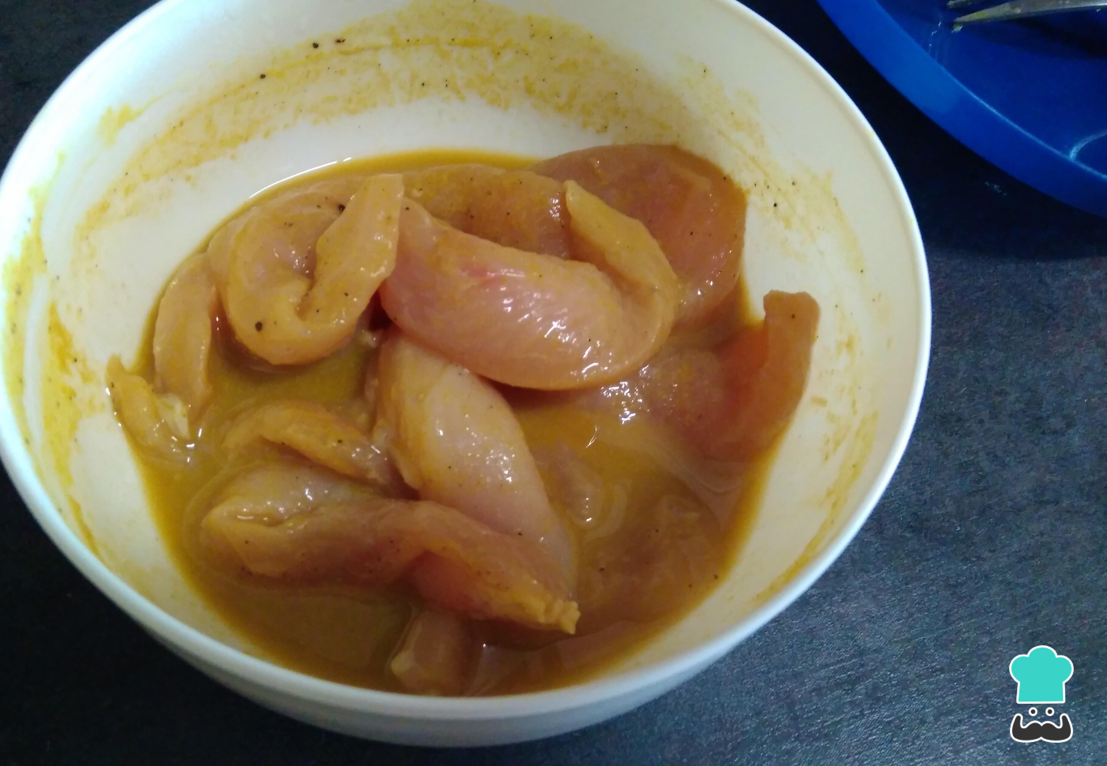Como la receta que haremos es de ensalada con pollo, lo primero que tenemos que hacer es el pollo. Para ello, corta el pollo en tiras, pinchalo con un tenedor y ponlo a macerar con la pimienta, la miel y la mostaza.