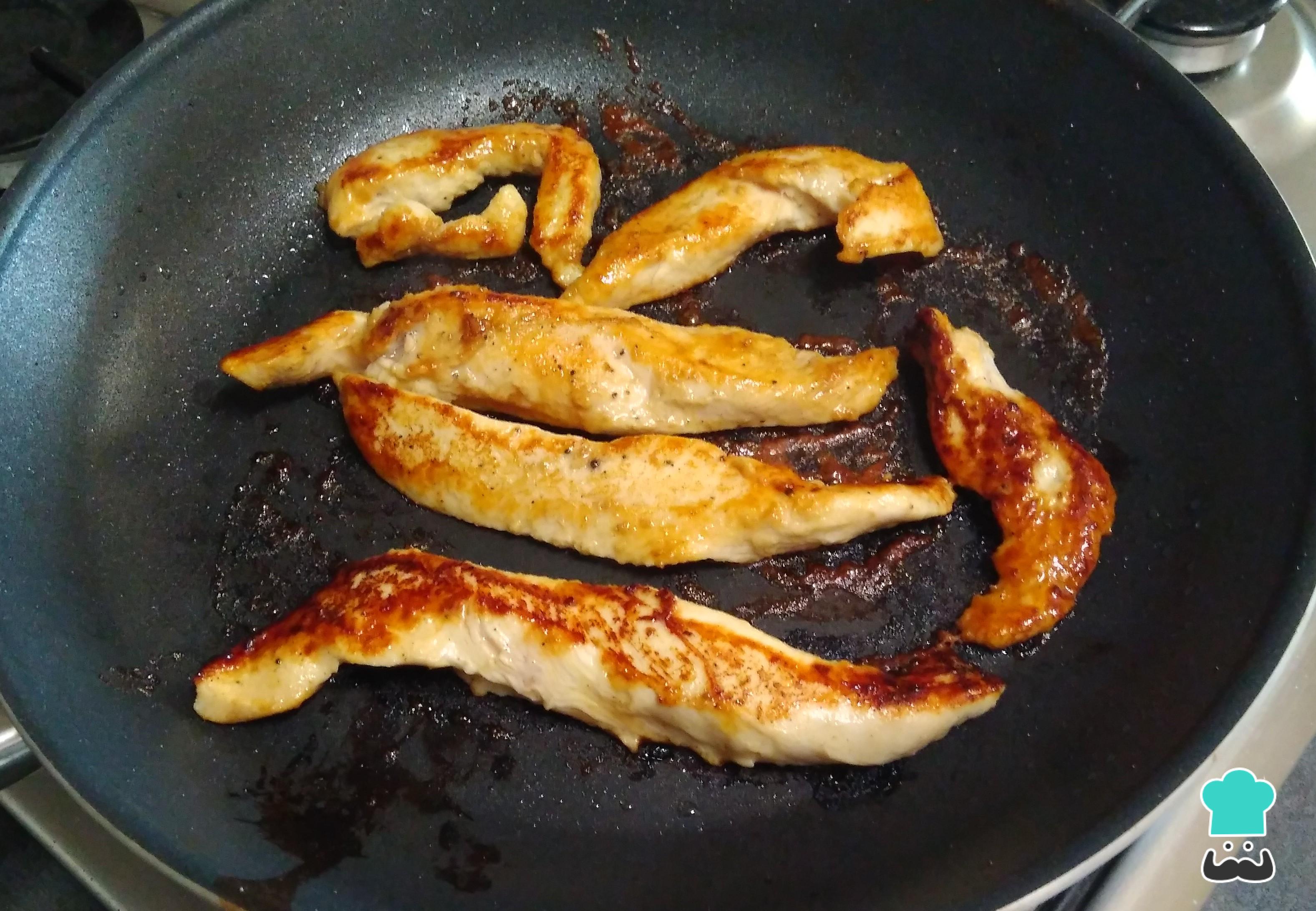 Pasado el tiempo de marinado, cocinamos el pollo a la plancha en una sartén con fuego medio. Espera hasta que esté dorado y echo y luego, córtalo en cuadritos.