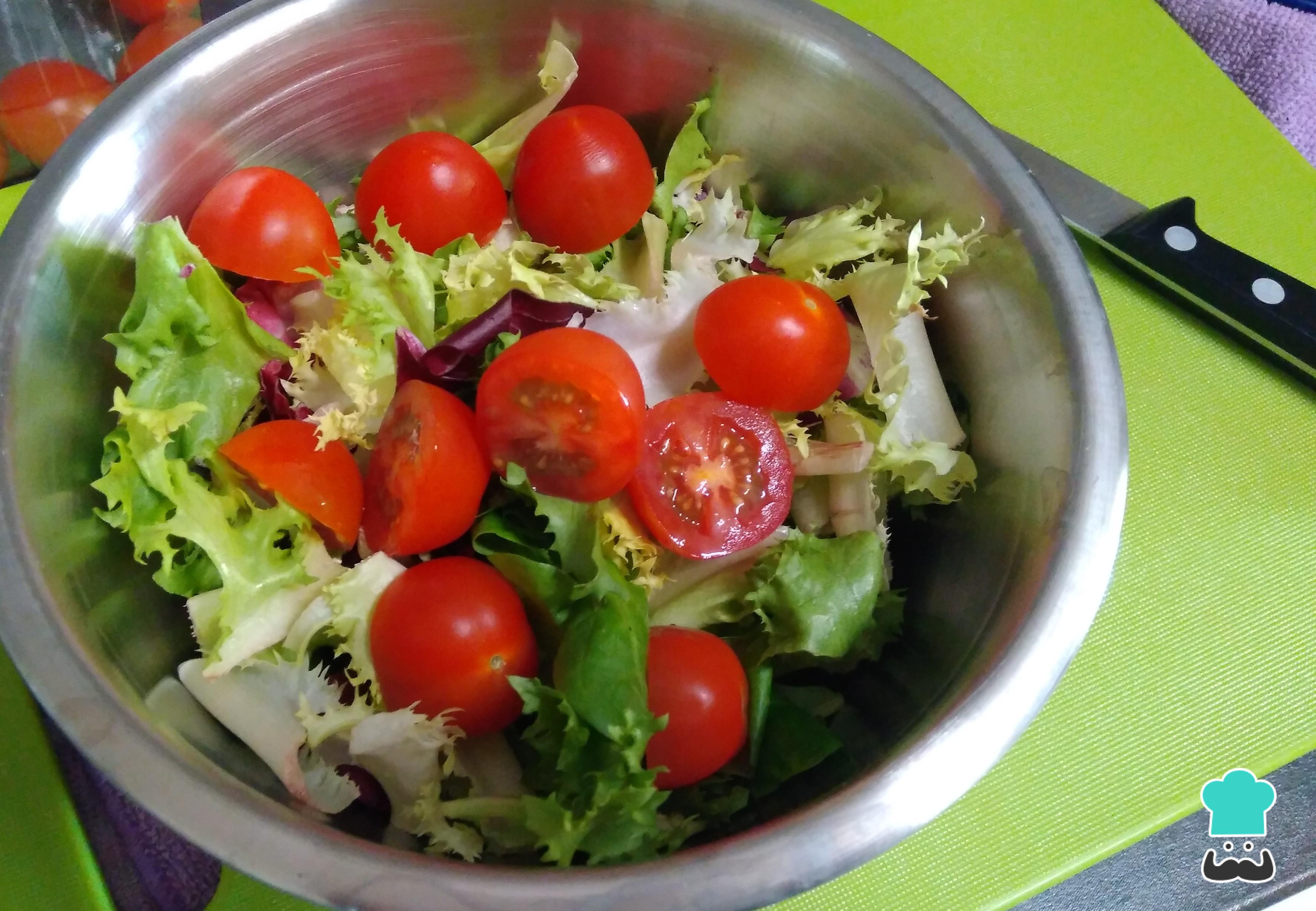 Por otro lado, empezamos a montar la ensalada colocando en un bol la mezcla de lechuga junto con los tomates cherry partidos por la mitad.