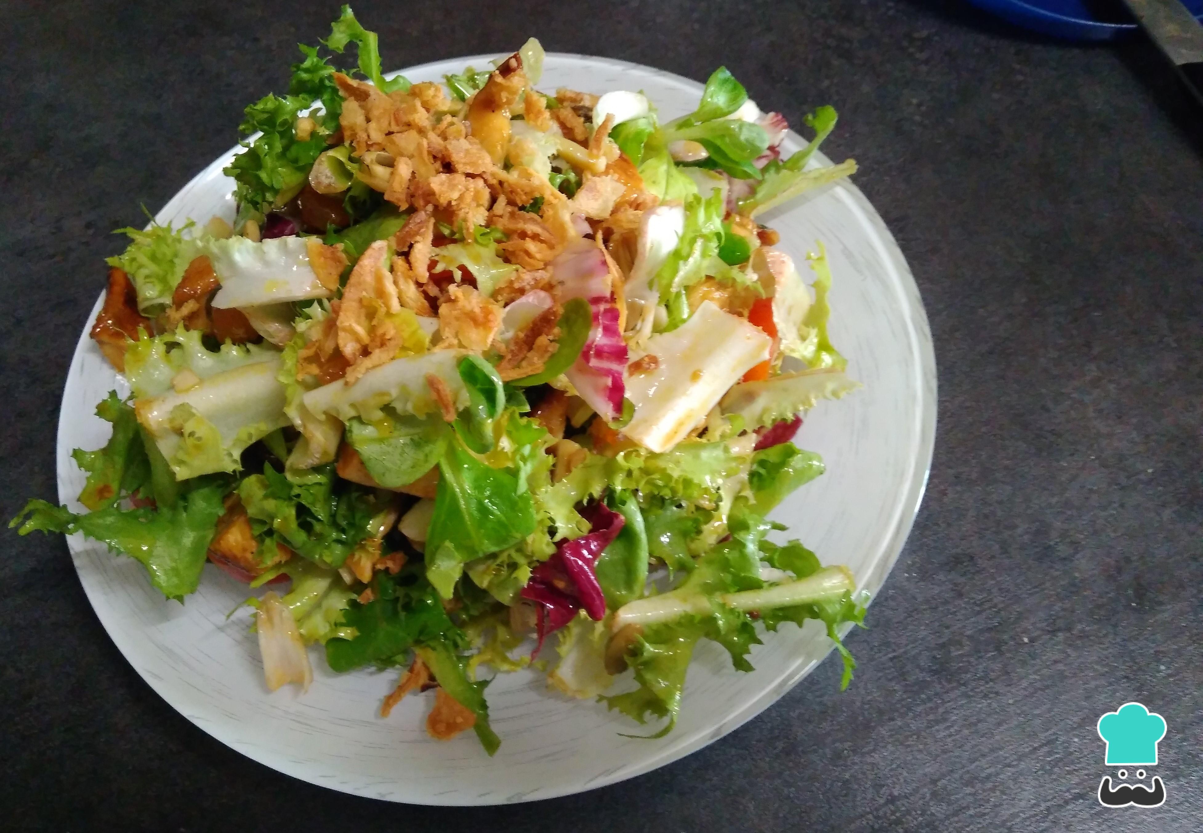 Finalmente, baña toda la ensalada con la vinagreta y vuelve a mezclar todo para se impregne por completo. El único ingrediente que nos queda es la cebolla frita o deshidratada, que a mi me gusta añadir al final, directamente en el plato.