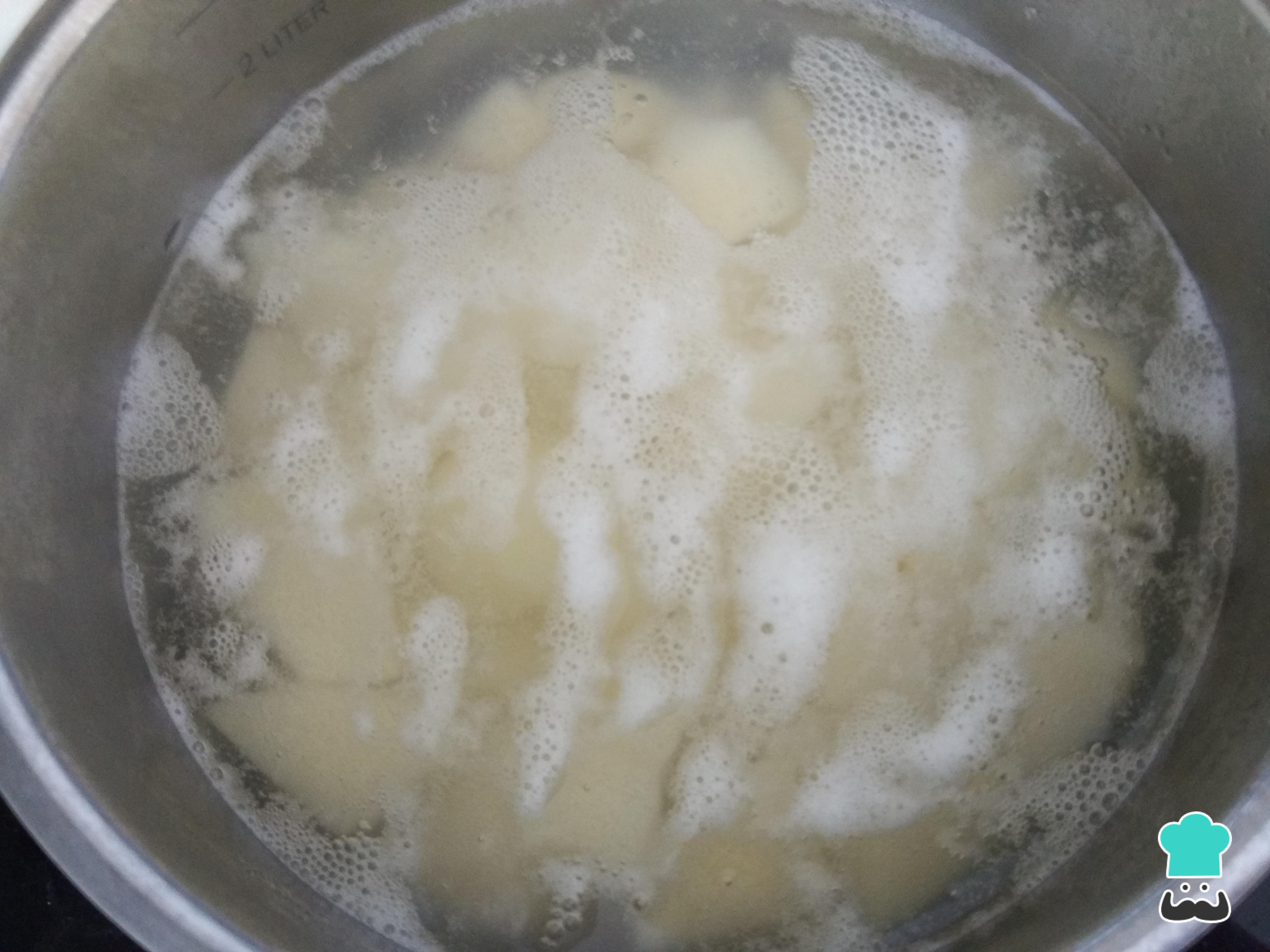 En primer lugar, pelamos y cocemos las patatas en abundante agua hirviendo con un poco de sal. Para que tarden menos tiempo en cocer, las cortamos en trozos. El tiempo de cocción es de unos 10 minutos.