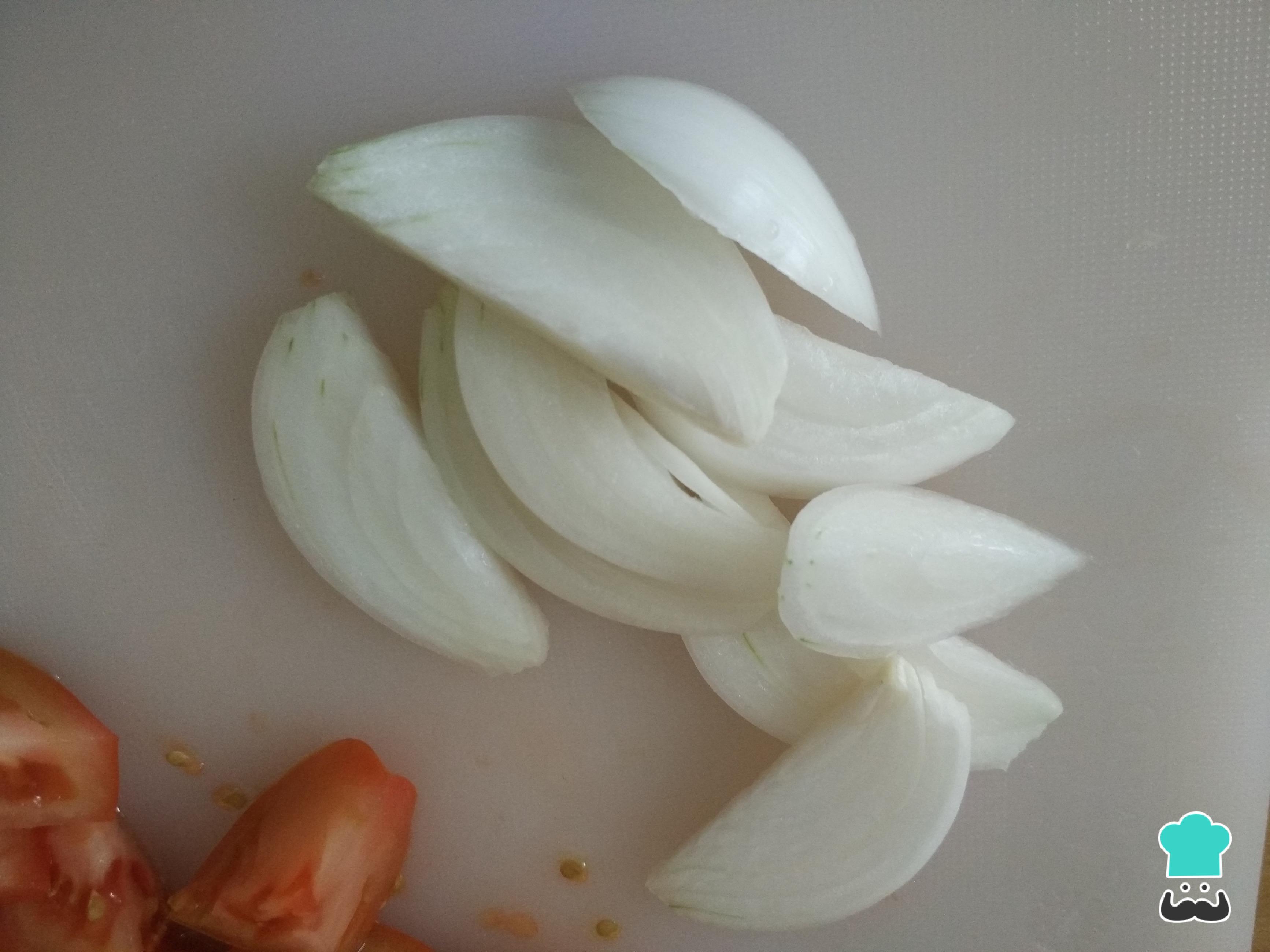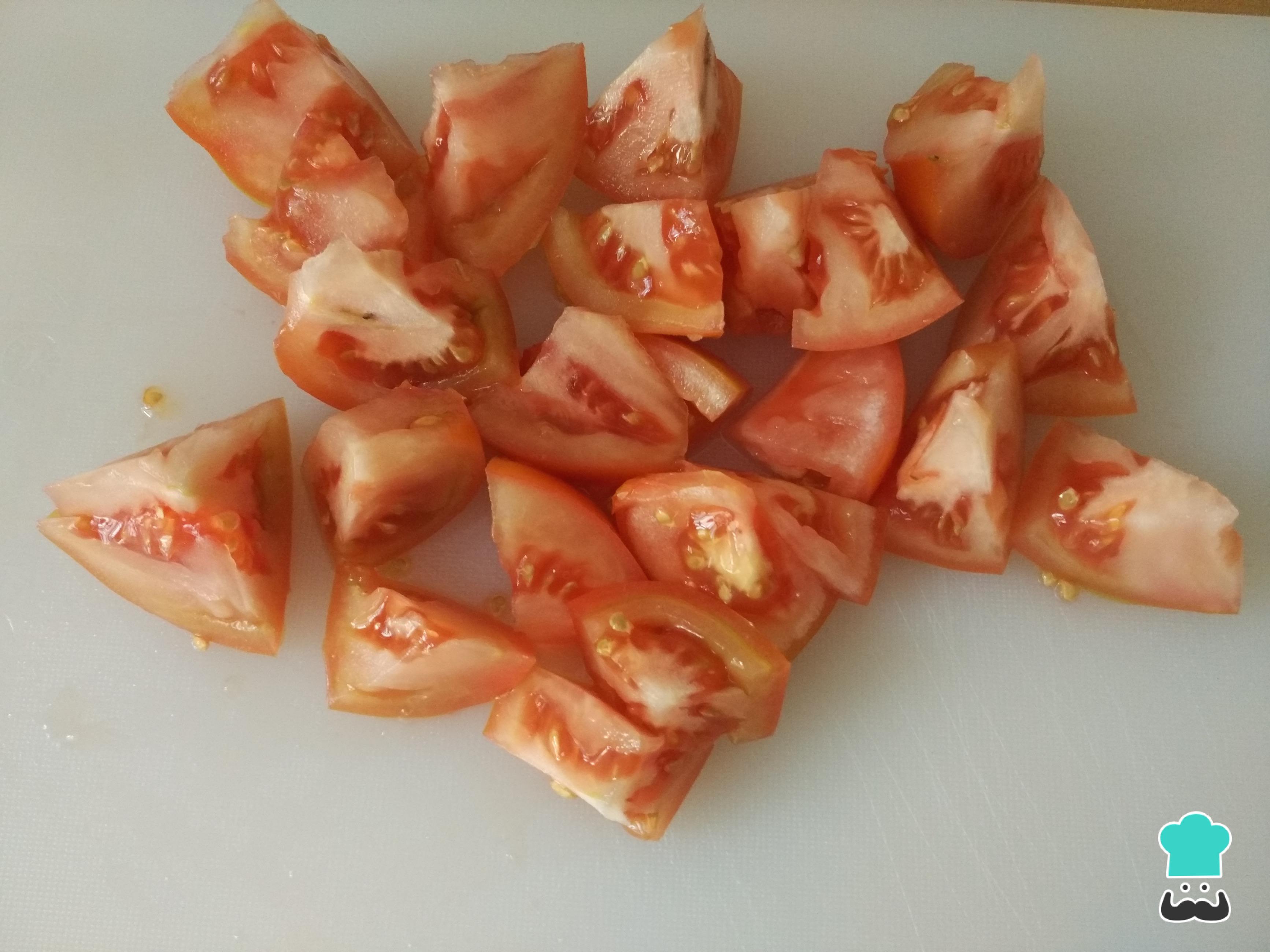 A continuación, cortamos el tomate en gajos pequeños y lo colocamos en una ensaladera. Para la ensalada de pulpo y patata hemos utilizado tomate de ensalada.
