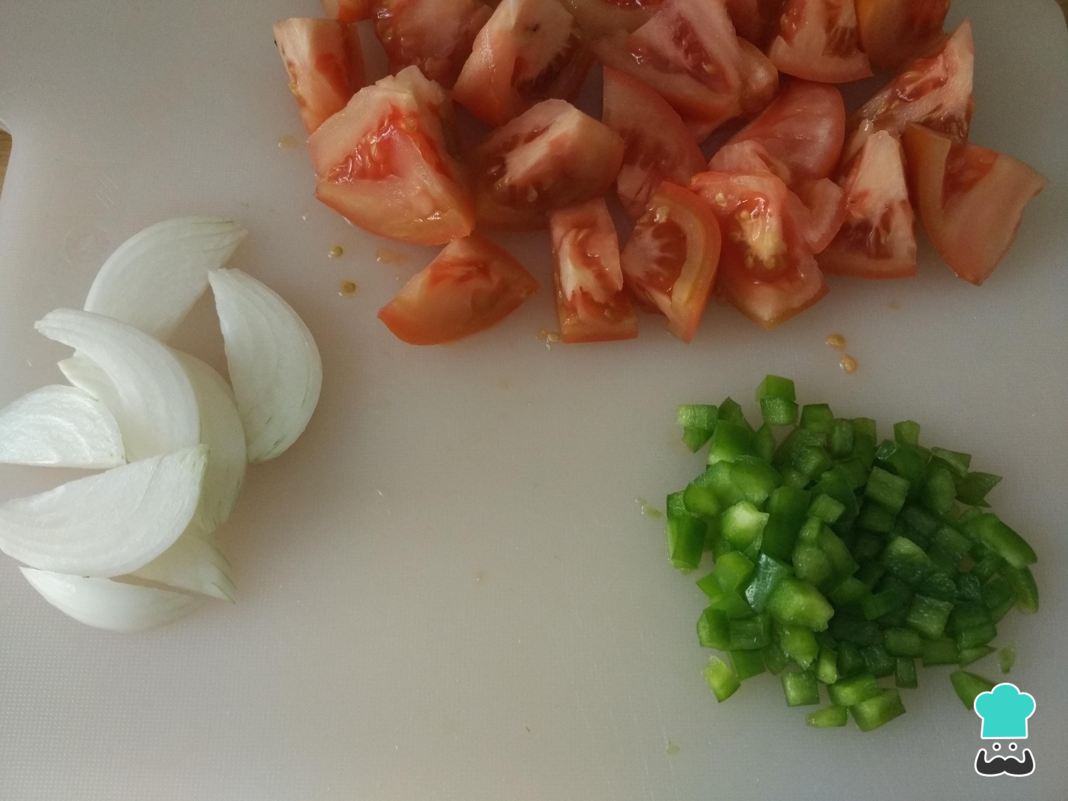 Por último, cortamos el pimiento verde en cuadraditos pequeños, tal y como indicamos en la imagen. Colocamos todas las verduras en una ensaladera y reservamos.