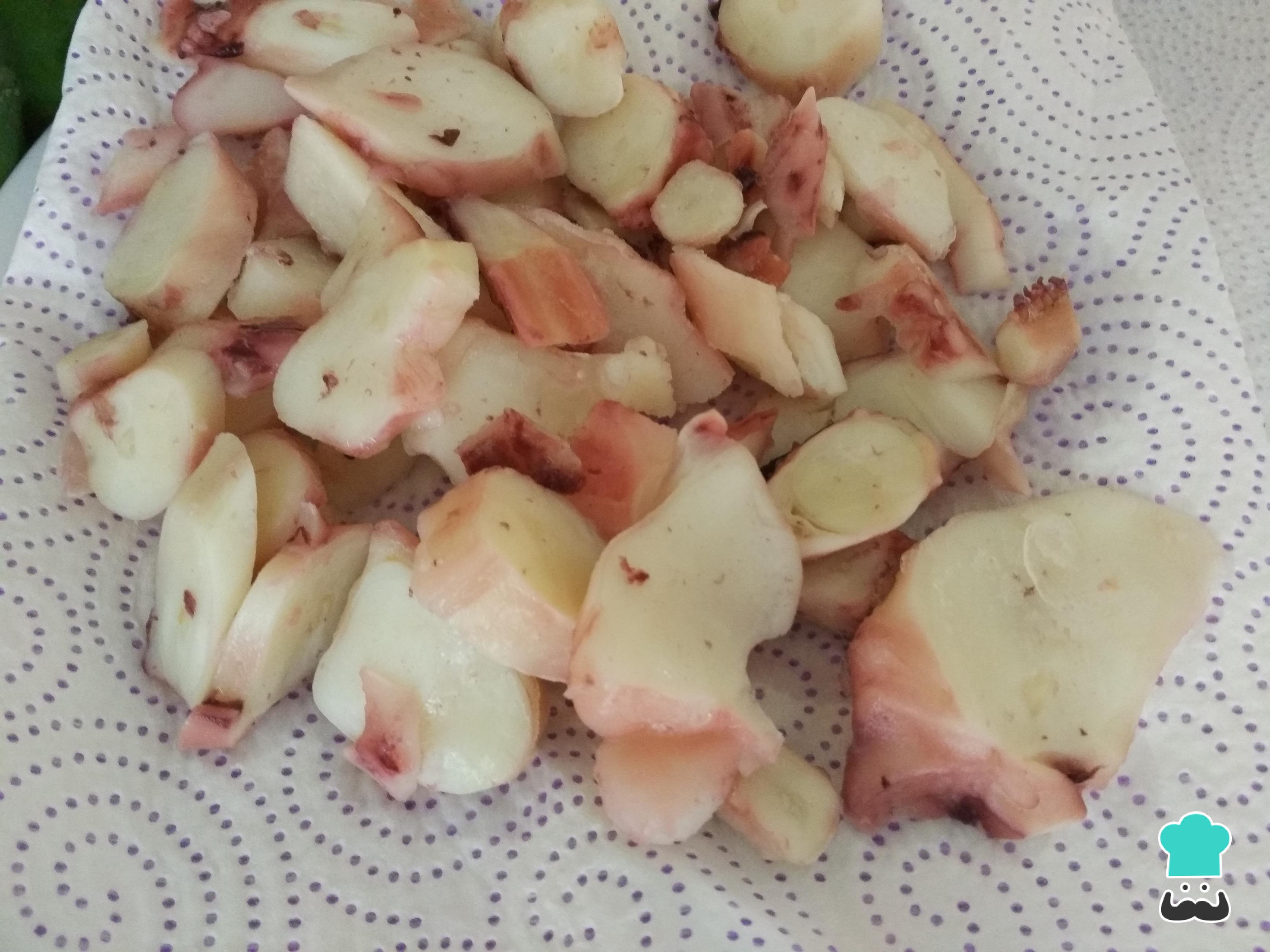 En esta ocasión hemos utilizado pulpo congelado. Para descongelar el pulpo lo hemos puesto en un plato sobre papel absorbente y hemos dejado que se descongele dentro de la nevera. Si usáis pulpo fresco y no sabéis cómo cocinarlo, en esta receta os mostramos cómo cocer pulpo.