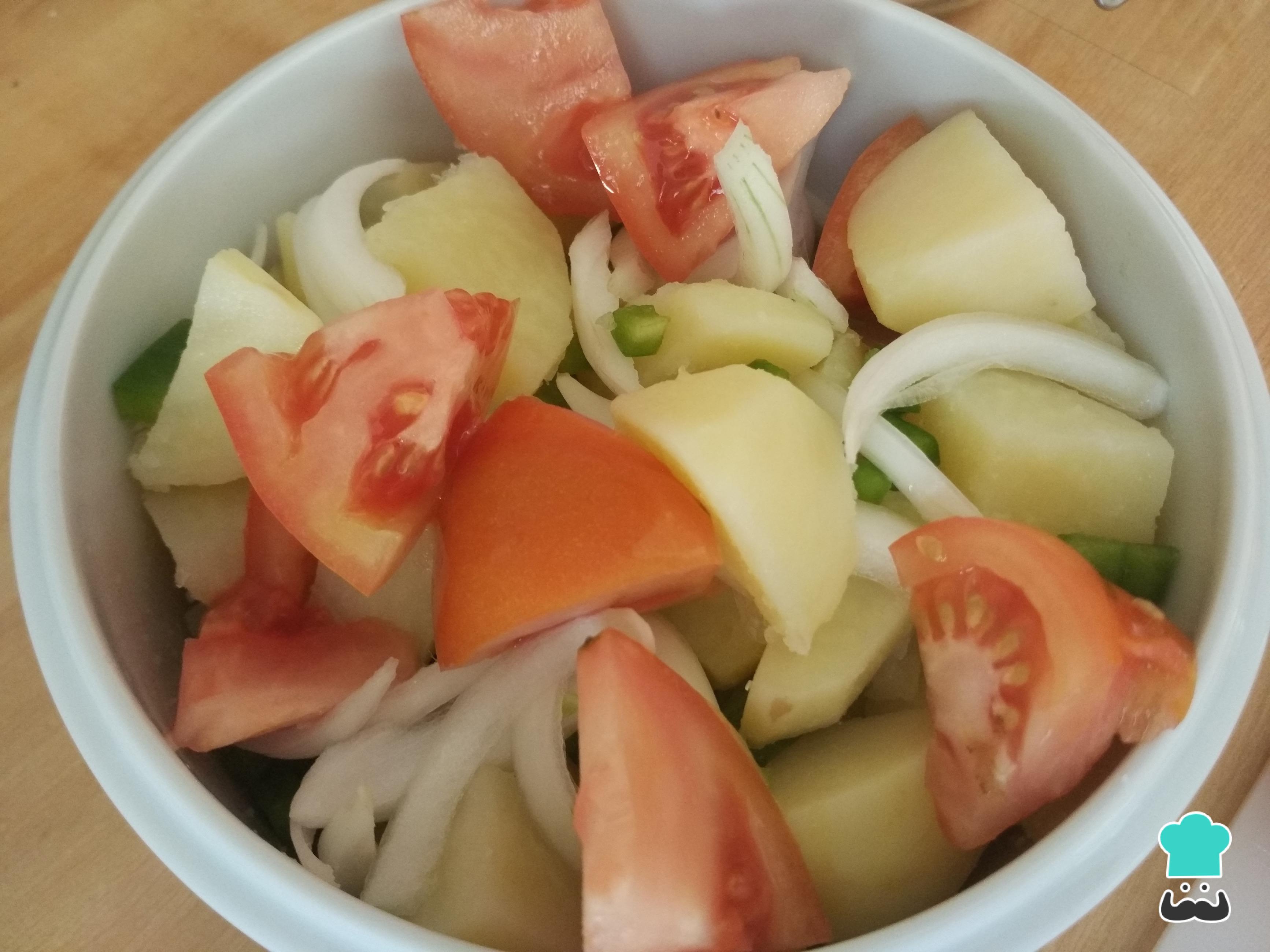 Una vez cocidas las patatas, dejamos que se enfríen y las añadimos a la ensaladera. Mezclamos bien todos los ingredientes de la ensalada de pulpo y patatas.