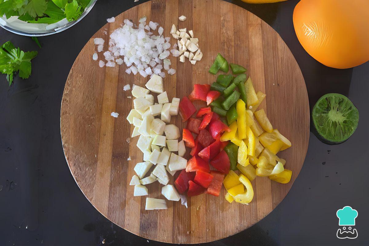 Una vez tengas la quinoa lista, es hora de preparar las verduras. Corta en brunoise la cebolla, el ajo, los pimientos, el ajo y el tapín mientras pones a calentar una sartén con un poco de aceite.