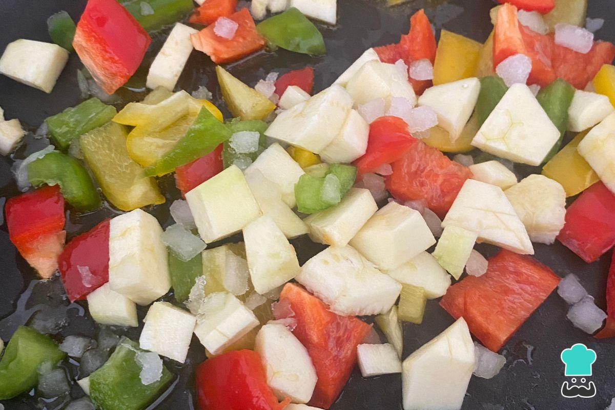 Cuando el aceite esté caliente, introduce todos los ingredientes y deja cocinar durante, aproximadamente, 15 minutos. Todo dependerá del punto de cocción que te guste en las verduras o de la calidad del fuego que tengas en casa.